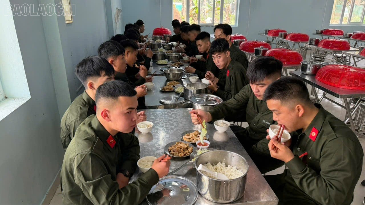 Đúng 11 giờ 30 phút, bữa ăn đầu tiên trong quân ngũ diễn ra với những trải nghiệm khác biệt so với khi ở nhà. Thực đơn gồm các món quen thuộc như: cơm, giò lụa, thịt lợn rang, bắp cải luộc và bát nước chấm ớt đỏ tươi, nhưng cách thức tổ chức lại mang đậm tính kỷ luật: xếp hàng đi ăn, mỗi người tự quản lý và vệ sinh bát đũa cá nhân.