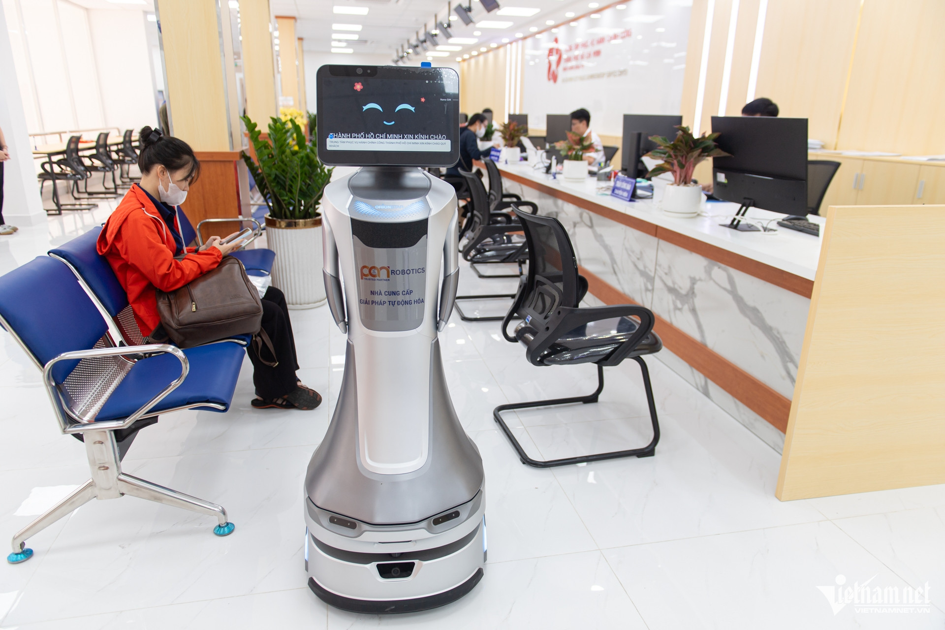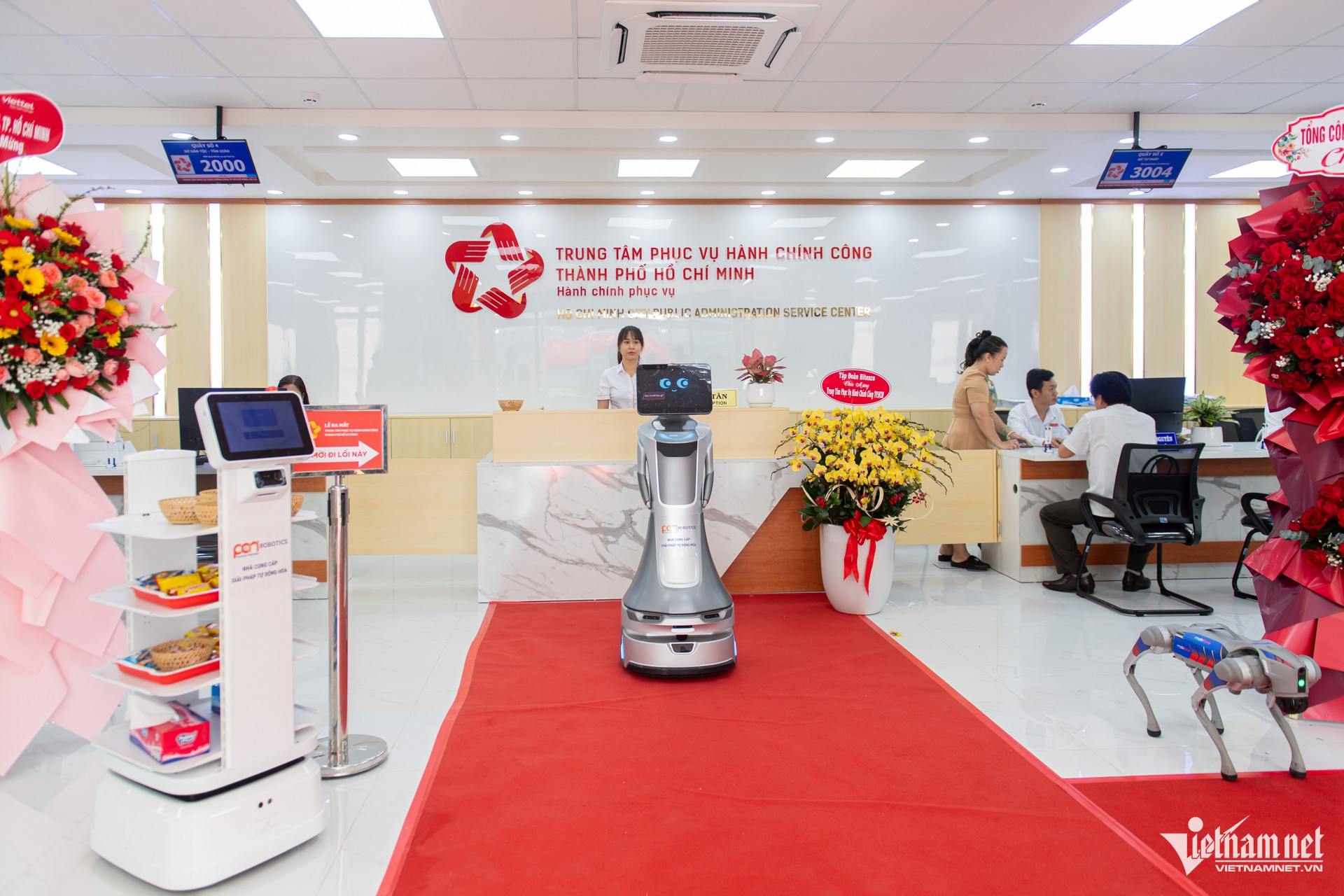 Trung tâm được bố trí 2 tầng, chia thành 6 khu vực tiếp nhận hồ sơ. Trong đó, tầng 1 tiếp nhận thủ tục của các đơn vị gồm: Sở Tư pháp, Sở Nội vụ, Sở Dân tộc và Tôn giáo, Sở An toàn thực phẩm, Sở Y tế, Sở Quy hoạch và Kiến trúc, Sở Xây dựng, Sở Du lịch, Sở Văn hóa và Thể thao, cùng Ban Quản lý các khu chế xuất và khu công nghiệp. Trong ảnh: Robot được bố trí để hỗ trợ hướng dẫn, cung cấp thông tin và chỉ dẫn người dân đến các quầy chức năng tại Trung tâm Phục vụ hành chính công TPHCM.