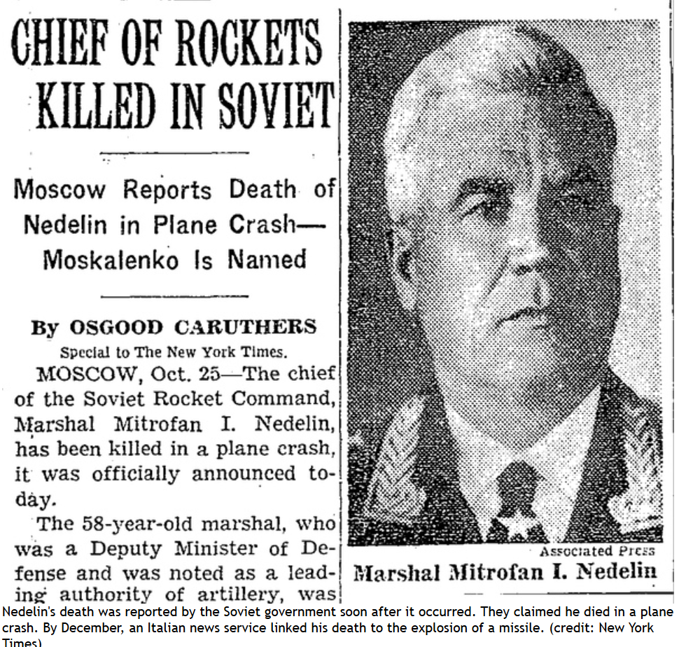 Tờ New York Times đưa tin vào ngày 25/10/1960 rằng Liên Xô thông báo cái chết của Nguyên soái Nedelin là do tai nạn máy bay.