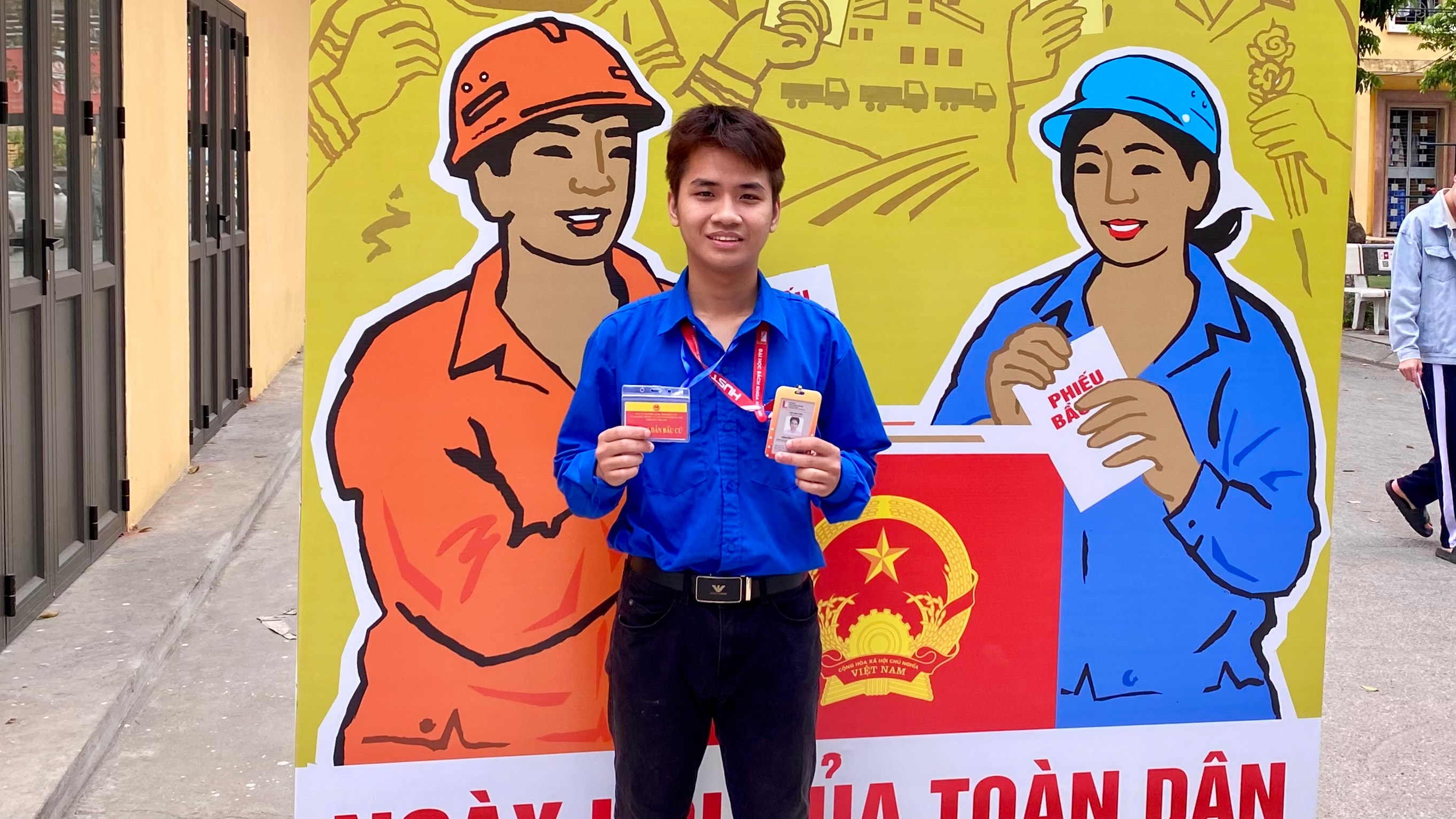 Không phải ai cũng thể hiện tinh thần công dân bằng cách đứng trong hàng chờ nhận phiếu. Nguyễn Bá Đạt, sinh viên lớp Kỹ thuật máy tính 03, có mặt tại điểm bỏ phiếu từ 5 giờ 30 sáng, em không chỉ đến để bỏ phiếu, mà để hỗ trợ điều tiết giao thông và hướng dẫn cử tri vào khu vực bầu cử.