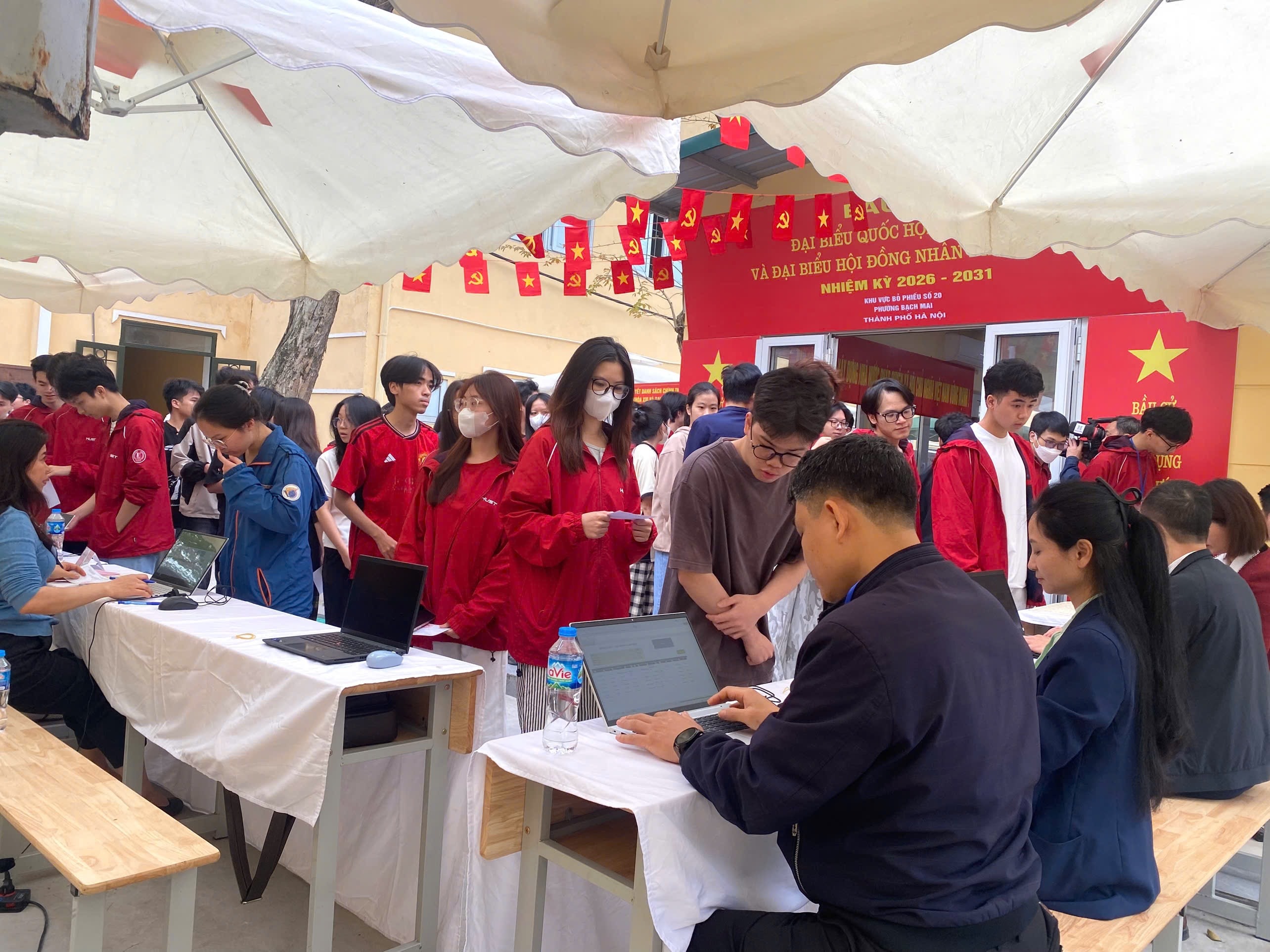 Tại khu vực bỏ phiếu số 20 của phường Bạch Mai, những cử tri đầu tiên bắt đầu thực hiện quyền bỏ phiếu trong sự hướng dẫn chặt chẽ, nề nếp. Được biết, điểm bỏ phiếu này có hơn 3.000 sinh viên tham gia bầu cử, trở thành một trong những khu vực tập trung đông cử tri trẻ của Hà Nội trong ngày bầu cử.