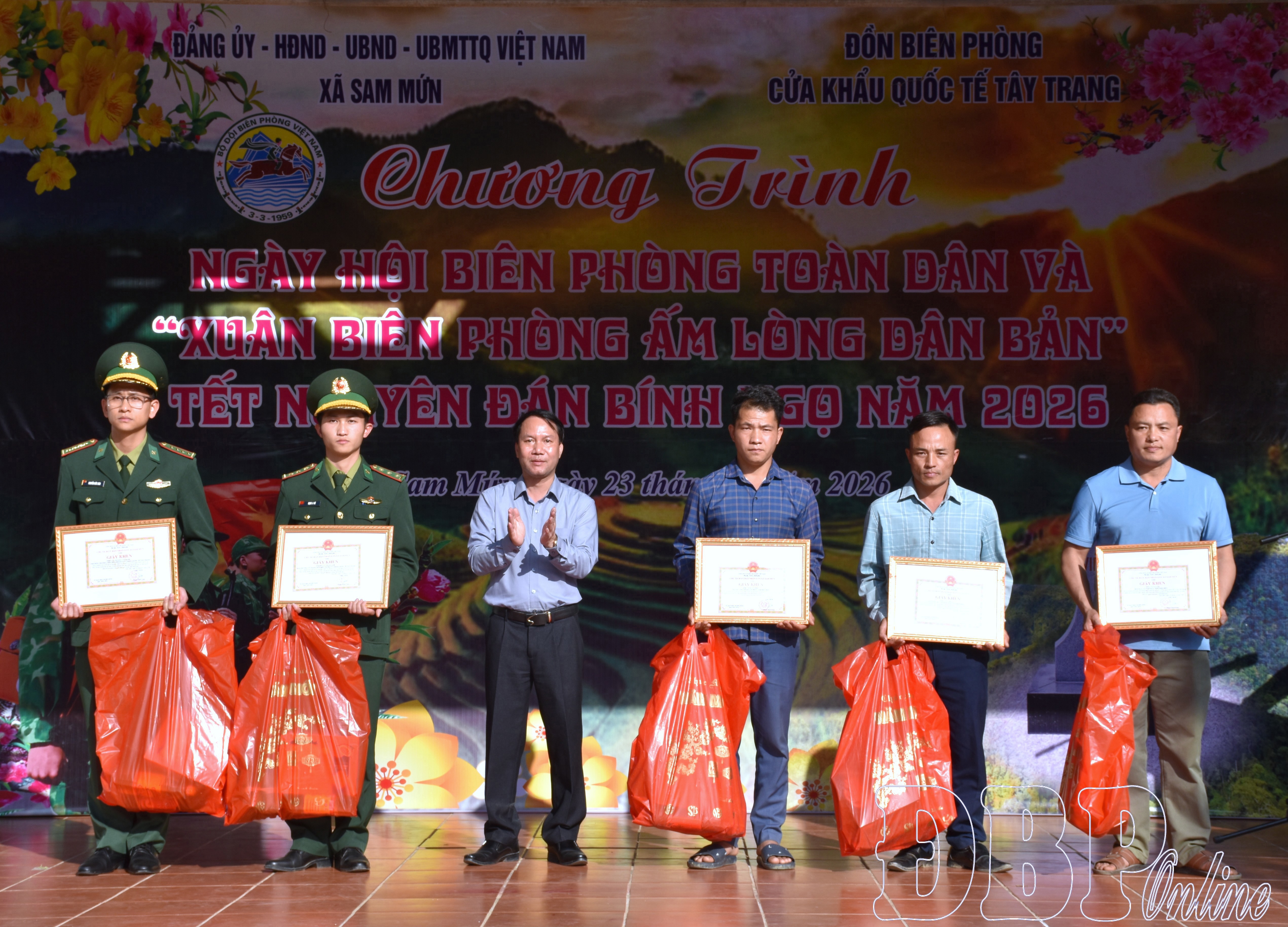 Nhân dịp này, Ban Chỉ huy Bộ đội Biên phòng tỉnh và UBND xã Sam Mứn tặng Giấy khen cho 4 tập thể, 7 cá nhân tiêu biểu có thành tích xuất sắc trong thực hiện Chỉ thị 01 của Thủ tướng Chính phủ. Các cơ quan, đơn vị, doanh nghiệp, nhà hảo tâm cũng trao tặng quà Tết cho 3 học sinh là “Con nuôi Đồn Biên phòng” và 120 gia đình chính sách, hộ nghèo, gia đình tiêu biểu trong tham gia bảo vệ chủ quyền lãnh thổ, an ninh biên giới quốc gia.