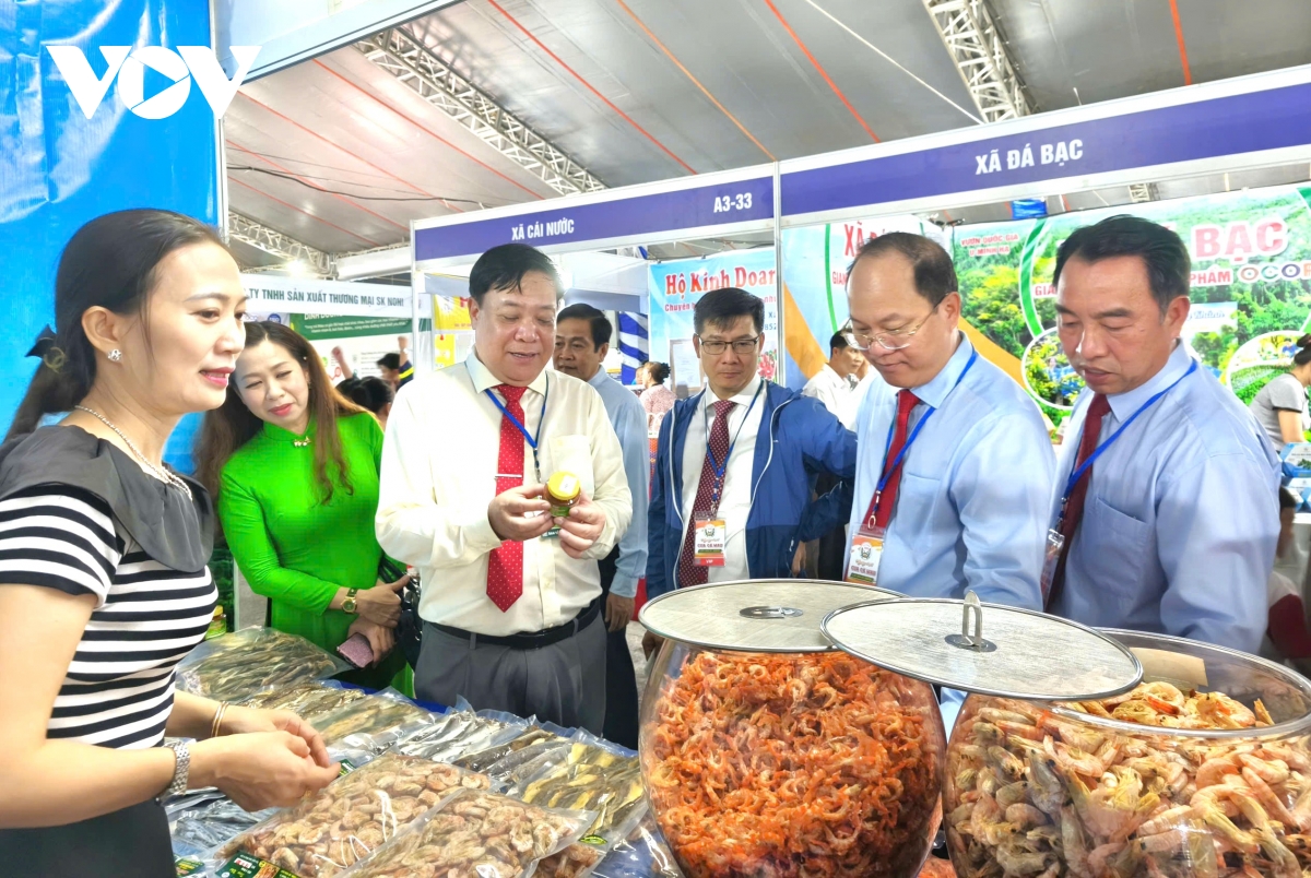 Lãnh đạo tỉnh Cà Mau tham quan gian hàng trưng bày sản phẩm tại Ngày hội.
