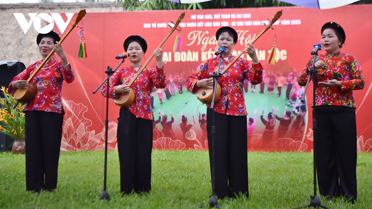 Chị Lô Thị Hương, dân tộc Nùng đến từ Thái Nguyên, đang sinh hoạt thường xuyên tại Làng văn hóa – du lịch Việt Nam, chia sẻ: “Đoàn dân tộc Nùng đã sinh hoạt thường xuyên cùng cộng đồng các dân tộc khác tại làng văn hóa đã được ba tháng rồi, hôm nay là ngày hội đoàn kết, dân tộc Nùng chúng tôi biểu diễn hát Then và đặc biệt là bài hát có tên là “Bài ca đoàn kết” của dân tộc Nùng. Dù trời mưa nhưng chương trình giao lưu vẫn rất vui vẻ, rất đoàn kết”.