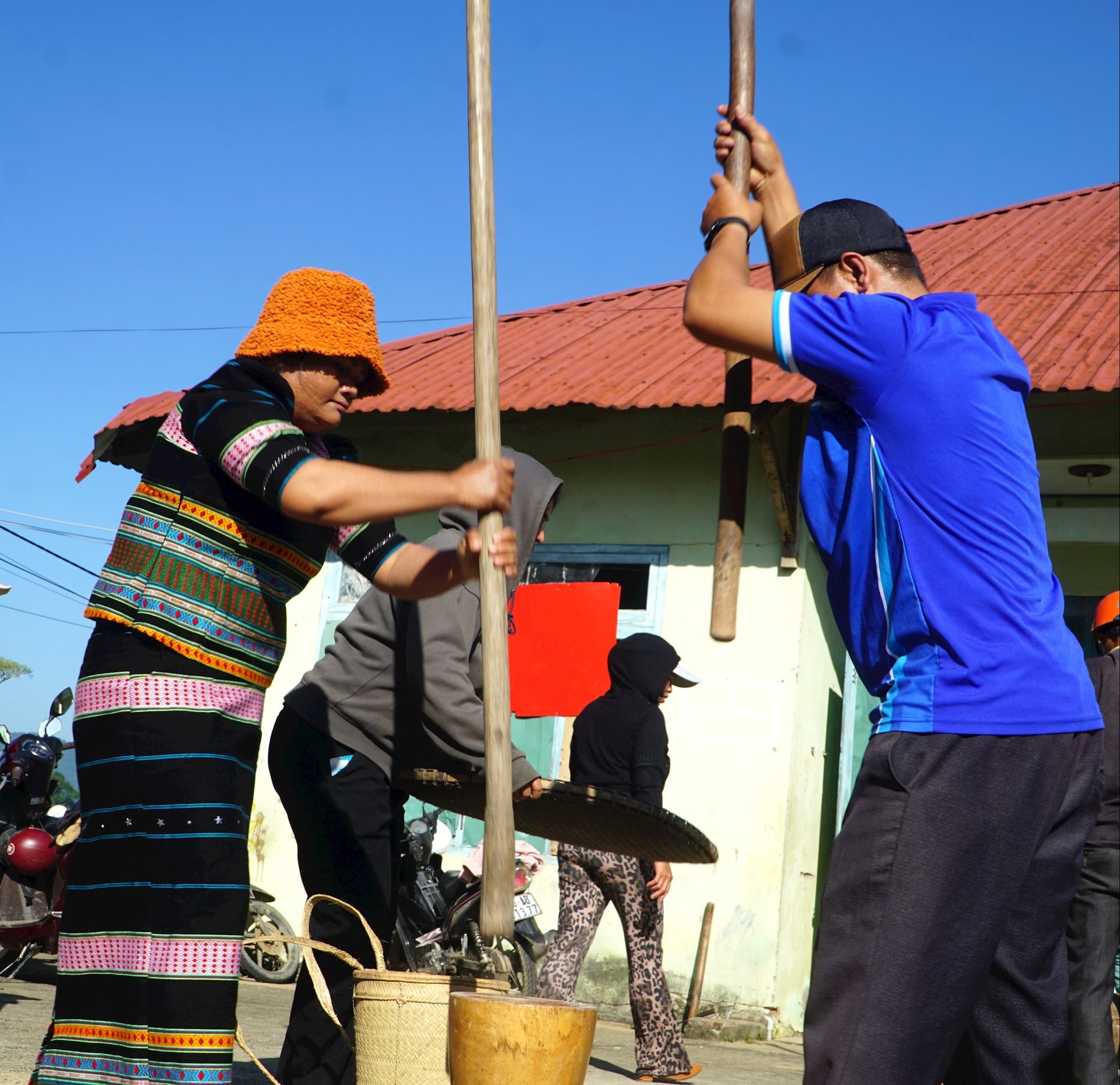Phần thi giã gạo chào mừng Ngày hội Đại đoàn kết toàn dân tộc năm 2025 của bà con thôn 2, xã Đông Giang