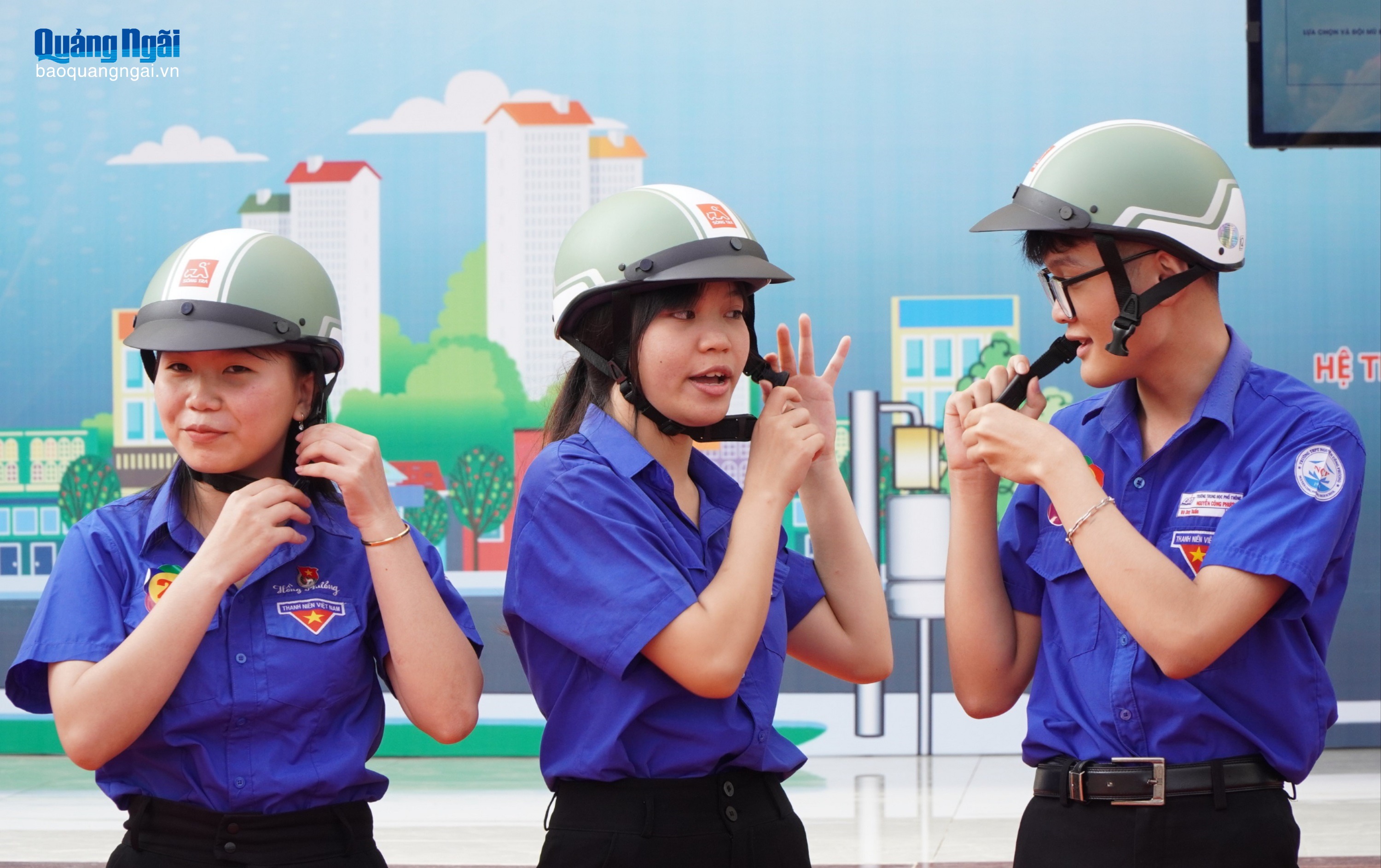 Đoàn viên tập đội mũ bảo hiểm đúng cách khi tham gia giao thông bằng xe gắn máy.