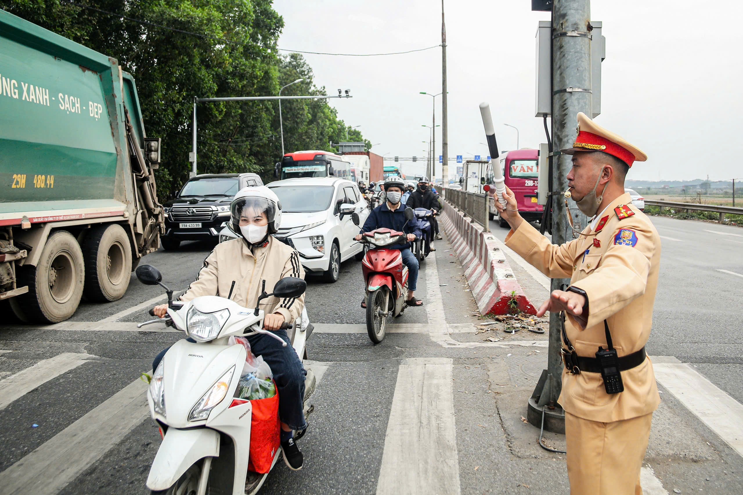 Tại cửa ngõ phía Bắc Thủ đô, Đội CSGT đường số 15 triển khai 100% cán bộ, chiến sĩ tuần tra, kiểm soát, chỉ huy điều khiển giao thông trên các tuyến huyết mạch như cầu Thăng Long, Võ Văn Kiệt, Võ Nguyên Giáp, Quốc lộ 2 – cao tốc Lào Cai, khu vực Cảng Hàng không quốc tế Nội Bài. Đây là các tuyến kết nối Hà Nội với các tỉnh trung du, miền núi phía Bắc và cửa ngõ hàng không quốc tế – nơi lượng phương tiện tăng cao đột biến trong chiều cuối cùng trước kỳ nghỉ dài ngày.
