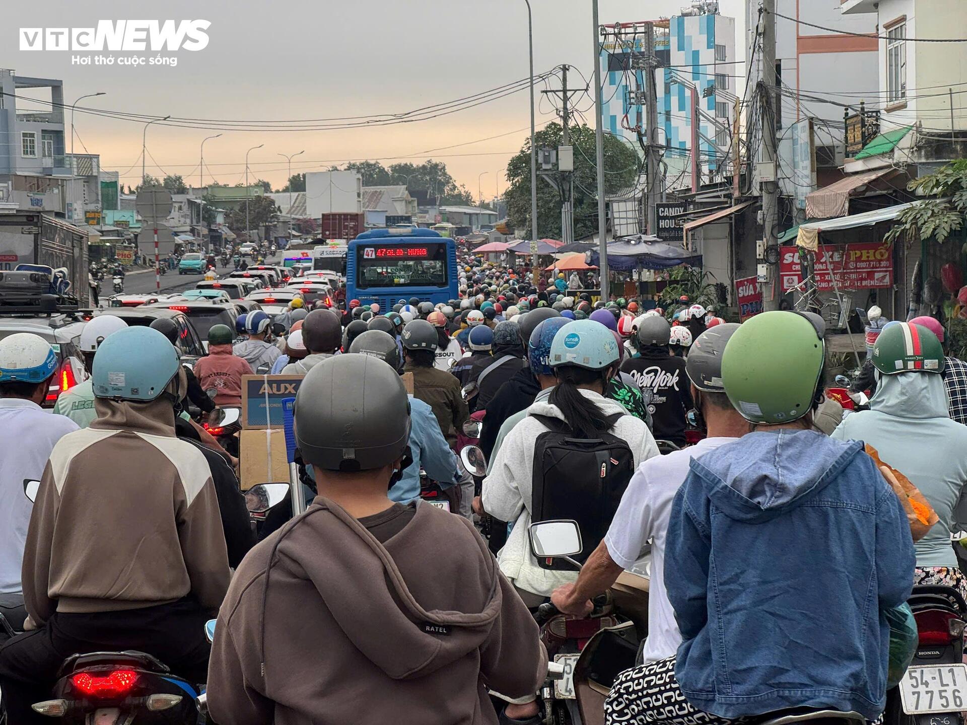 Không chỉ tại bến xe, ghi nhận tại cửa ngõ miền Tây trên quốc lộ 50, dòng xe máy nối đuôi nhau hướng về các tỉnh miền Tây. Càng về chiều, mật độ phương tiện càng dày đặc, nhiều đoạn di chuyển chậm do lượng người rời thành phố tăng đột biến trong ngày làm việc cuối cùng.