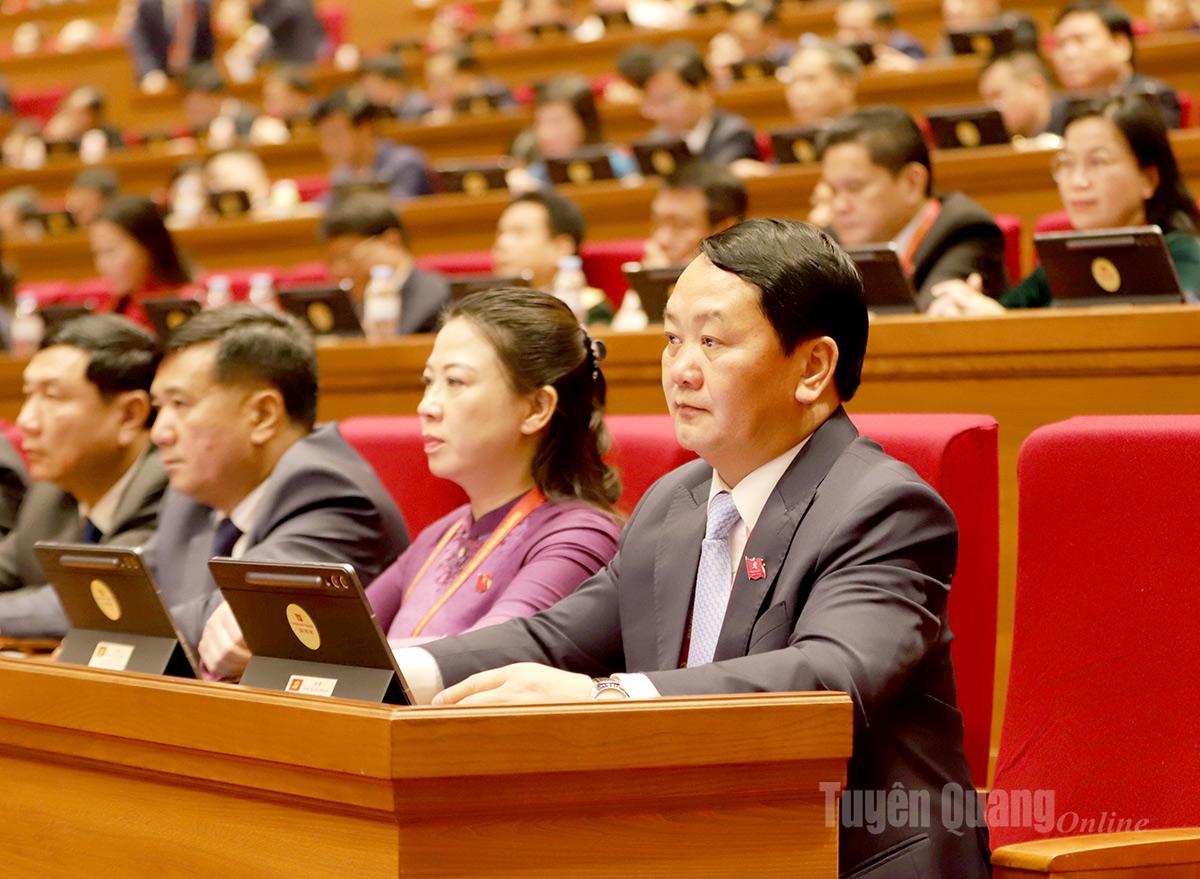 Bí thư Tỉnh ủy Hầu A Lềnh, Phó Bí thư Thường trực Tỉnh ủy Lê Thị Kim Dung và các đại biểu đoàn Tuyên Quang tham dự phiên trù bị Đại hội.