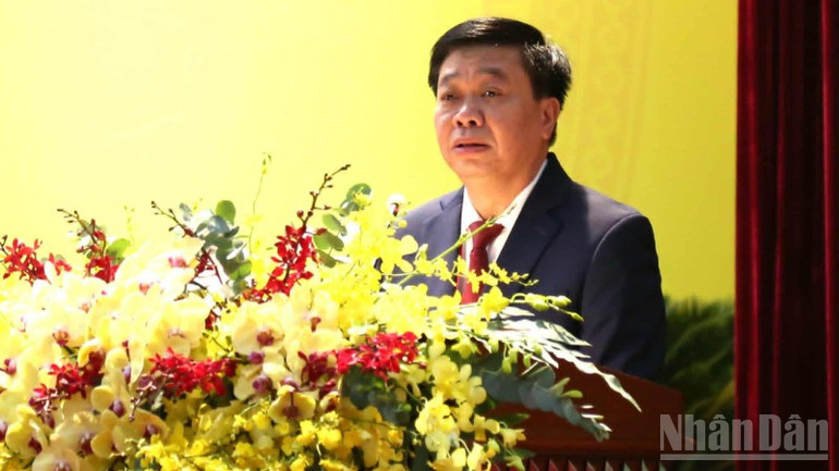 Đồng chí Nguyễn Hữu Nghĩa, Bí thư Tỉnh ủy Hưng Yên, phát biểu trong phiên thứ nhất của Đại hội.