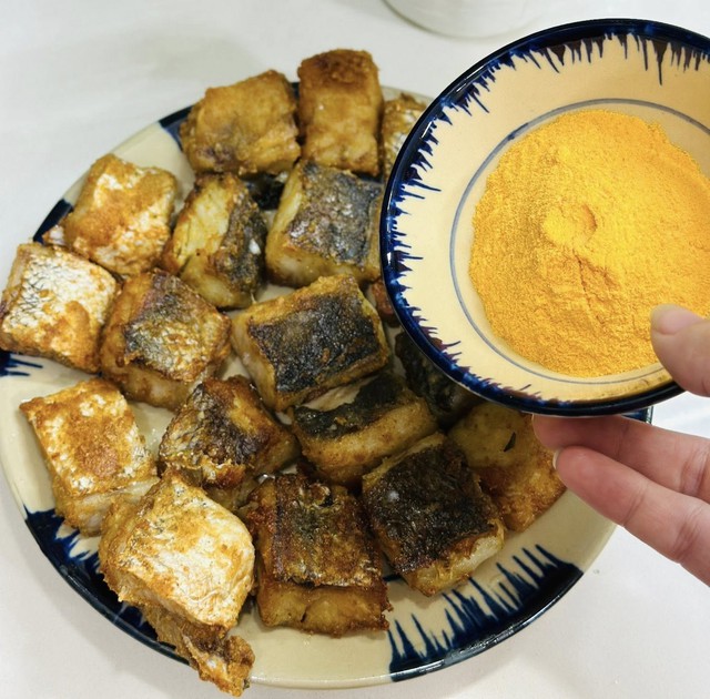 Khi cá còn nóng, rắc phô mai bột lên, lắc nhẹ cho phô mai bám đều. Ảnh: Thanh Huệ