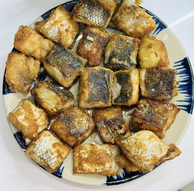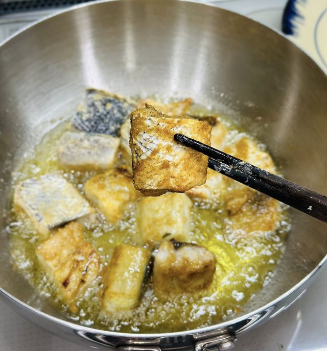 Bước 1 sơ chế cá, đem rửa nhanh cá khô một nắng bằng nước sạch rồi thấm khô. Cắt miếng vừa ăn rồi lăn đều cá qua lớp bột chiên giòn khô, phủ kín để khi chiên cá giòn hơn. Ảnh: Thanh Huệ