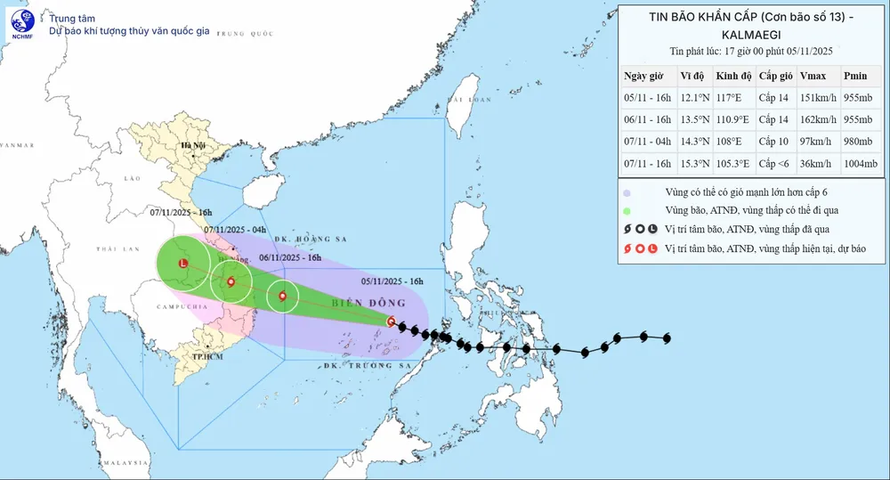 Chiều 5-11, Trung tâm Dự báo Khí tượng Thủy văn quốc gia cho biết lúc 16 giờ, tâm bão số 13 (tên quốc tế là bão Kalmaegi) ở vào khoảng 12,1 độ Vĩ Bắc; 117,0 độ Kinh Đông.