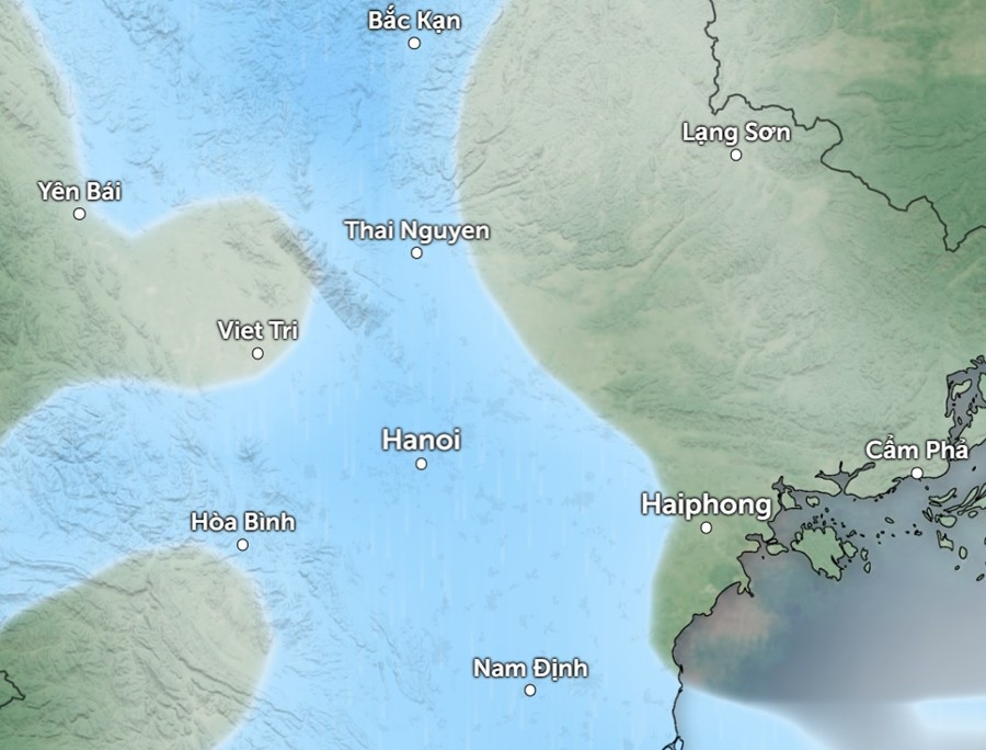 Mô hình GFS (Hệ thống Dự báo Toàn cầu) dự báo mưa nhỏ ở một số khu vực tại miền Bắc sáng mai, 23/2. Ảnh: Zoom Earth, OpenStreetMap, GFS.