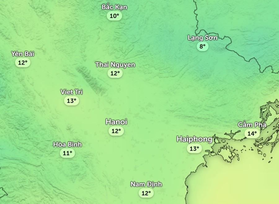 Dự báo sáng mai, 9/2, ở Hà Nội rất rét, nhiệt độ cảm nhận chỉ ở mức 12 - 13oC (sát hoặc đã là mức rét hại). Trong cả ngày, nhiệt độ có thể không vượt 15oC, như vậy Hà Nội sẽ có một ngày rét đậm. Nhiều người sẽ cảm thấy rét tê tái vì vừa trải qua kiểu thời tiết ấm và ẩm trong vài ngày trước.