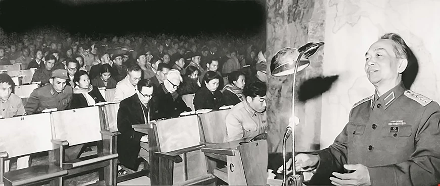 Đại tướng Võ Nguyên Giáp, Phó thủ tướng kiêm Bộ trưởng Bộ Quốc phòng, đọc báo cáo về tình hình và nhiệm vụ quân sự tại kỳ họp thứ 3, Quốc hội khóa IV, tháng 2/1973. Ảnh: Bảo tàng Hồ Chí Minh.