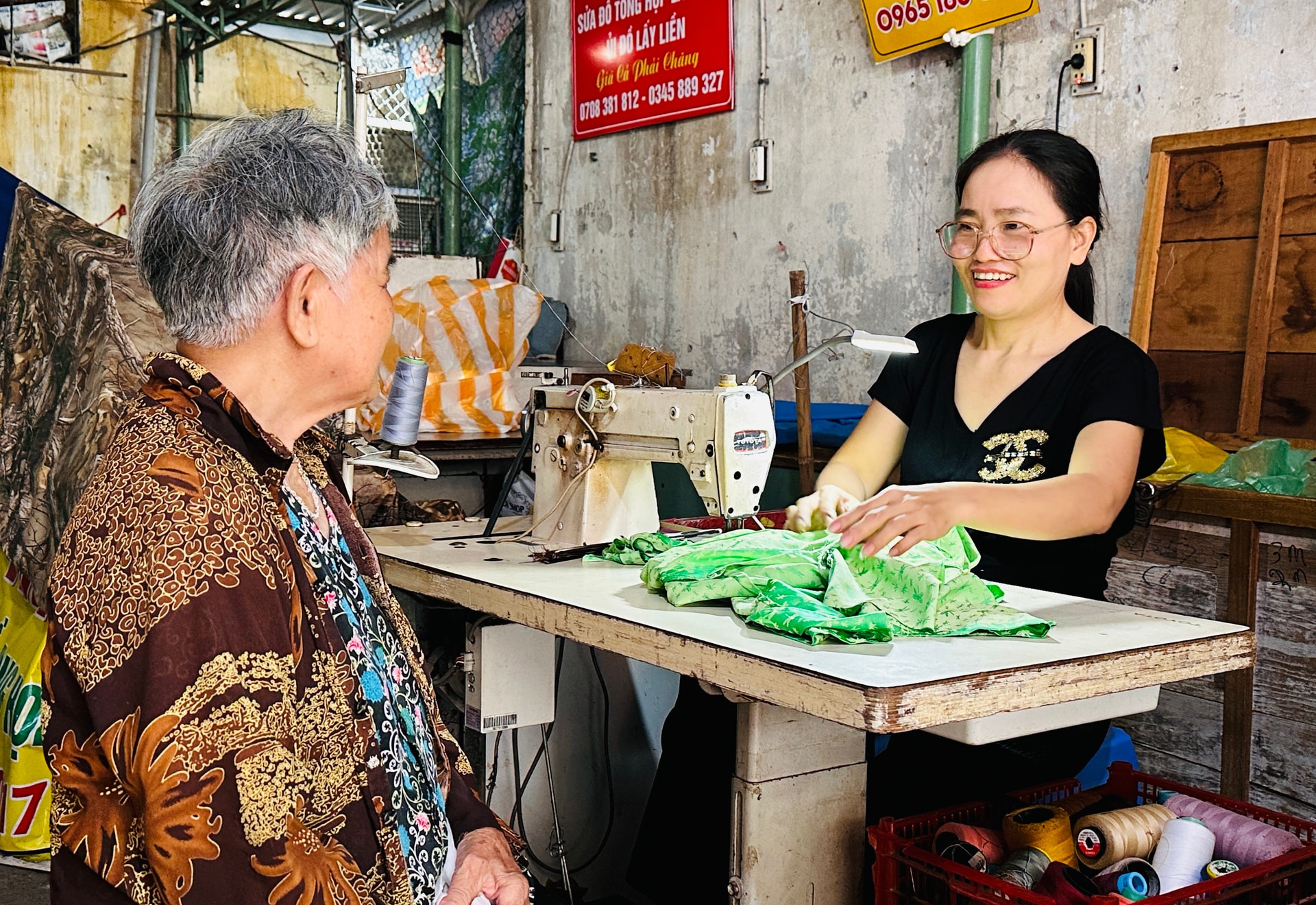 Bà Phạm Thị Đào (bên phải) dù tất bật công việc ở chợ vẫn nhiệt tình tư vấn pháp lý cho những người yếu thế. Ảnh: PHAN VINH
