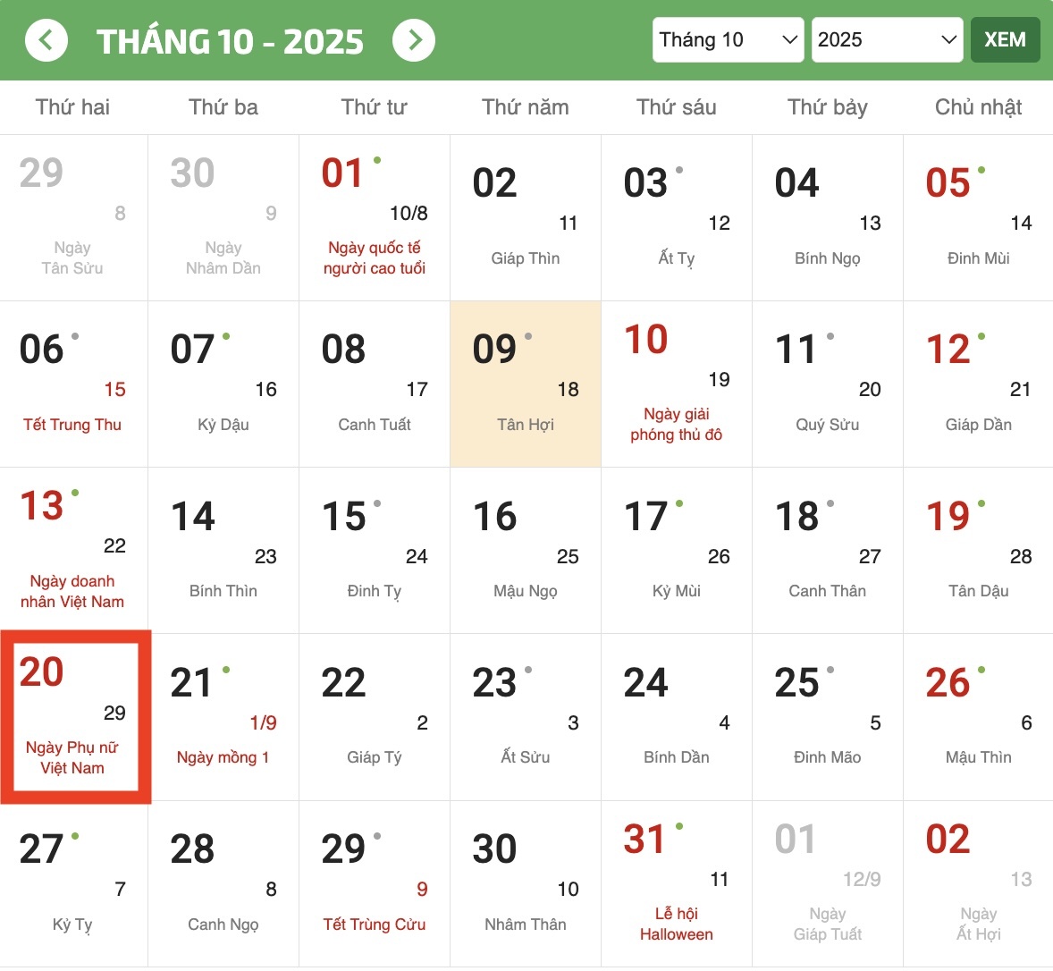 Ngày 20/10/2025 rơi vào thứ mấy?