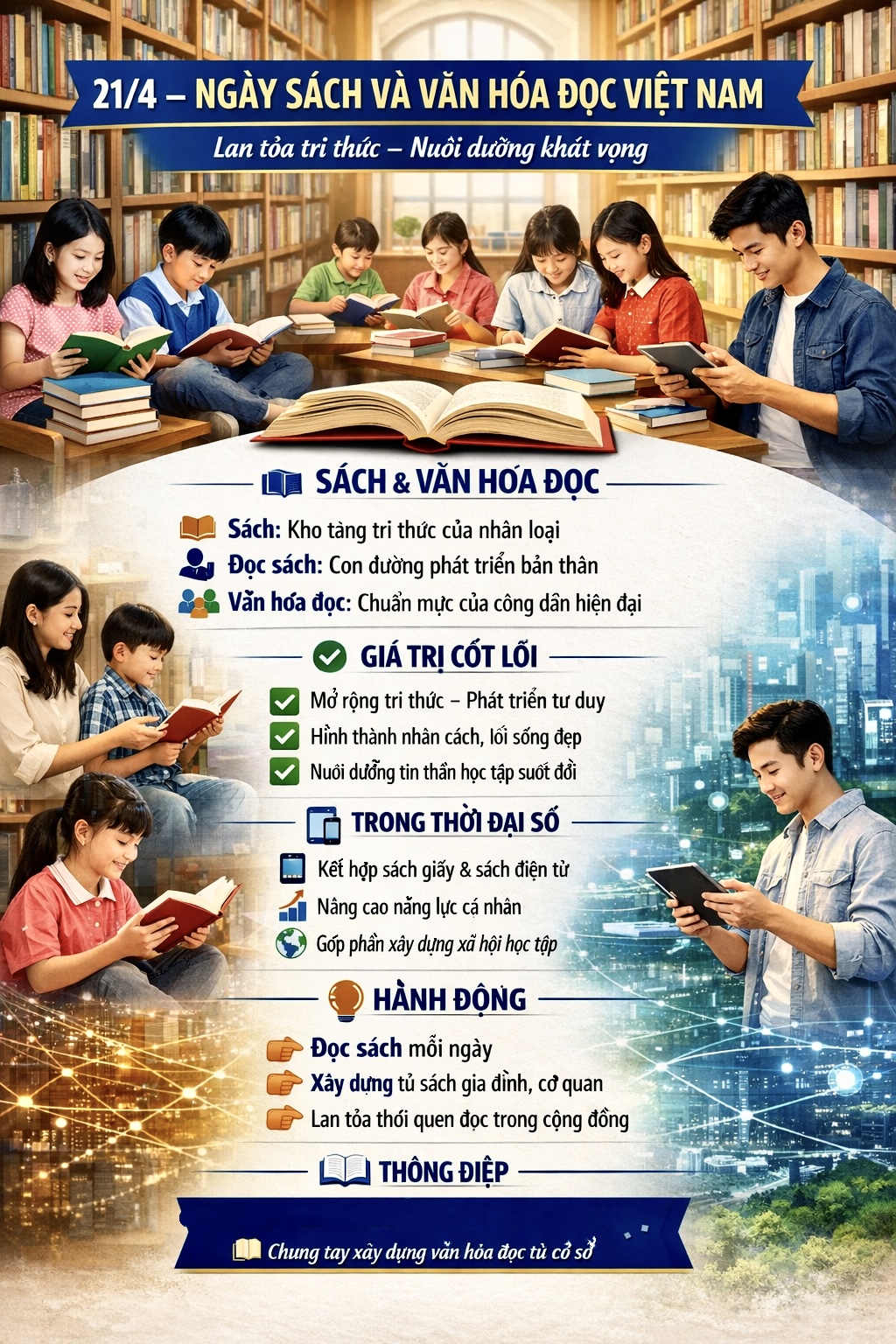 Nhân Ngày Sách và Văn hóa đọc Việt Nam (21/4), mỗi người hãy dành thời gian cho việc đọc, hướng tới xây dựng xã hội học tập, lan tỏa tri thức và những giá trị tốt đẹp trong cộng đồng.