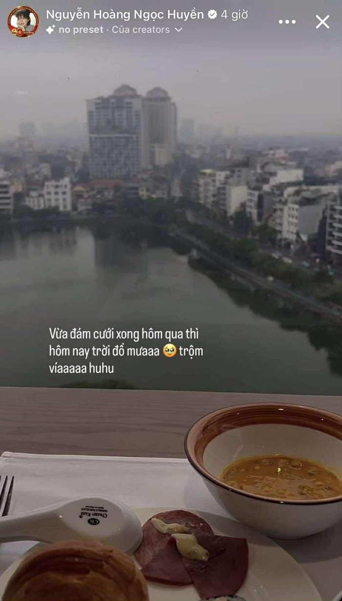 Kèm theo đó, nữ diễn viên cho biết: "Vừa đám cưới xong hôm qua thì hôm nay trời đổ mưa. Trộm vía huhu".