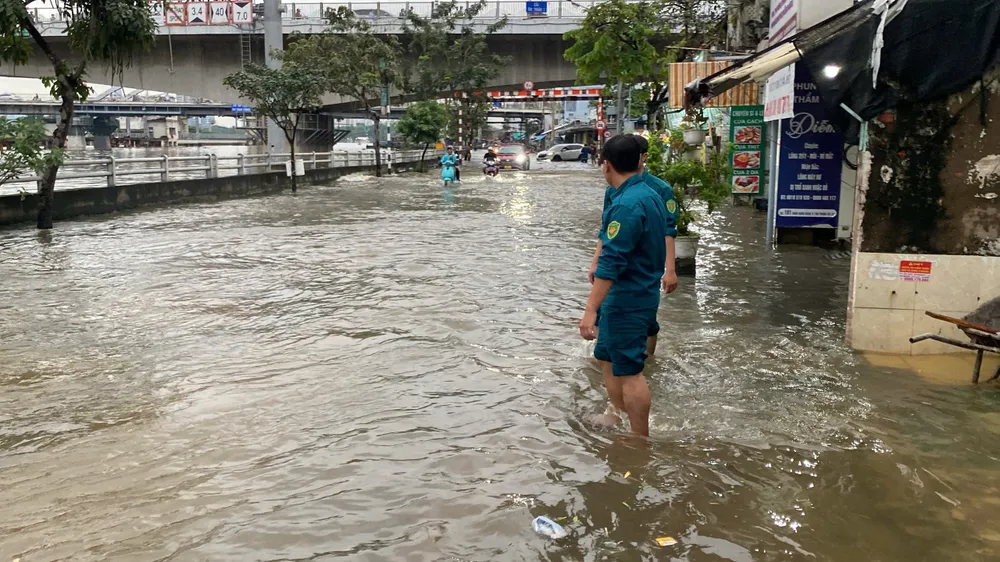 Trên đường Trần Xuân Soạn (đoạn cầu Tân Thuận, phường Tân Thuận) nước từ phía sông Sài Gòn tràn lên mặt đường khiến tuyến đường mênh mông nước. Khu vực dài khoảng 500m thường xuyên ngập sâu do triều cường.