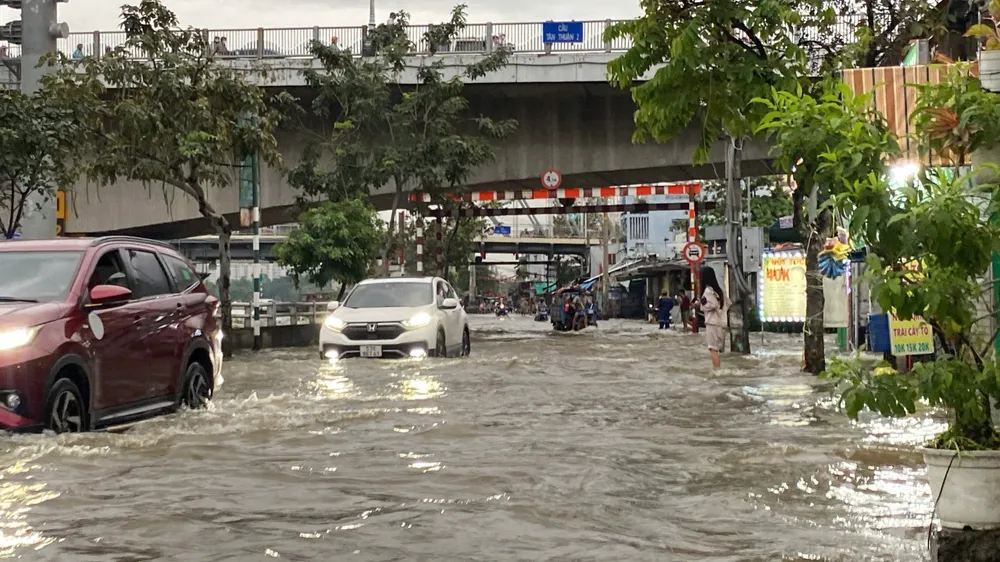 Chiều 7-11, triều cường tại TP.HCM vẫn ở mức cao, có trạm còn trên 1,8m, khiến nhiều tuyến đường trũng thấp lại bị ngập.