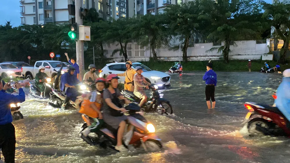 Tương tự, khoảng 18 giờ, đường Nguyễn Lương Bằng (phường Tân Mỹ) đã ngập sâu, nước liên tục dâng cao nhiều hơn khiến giao thông ùn ứ vì các phương tiện phải di chuyển chậm trong dòng nước.