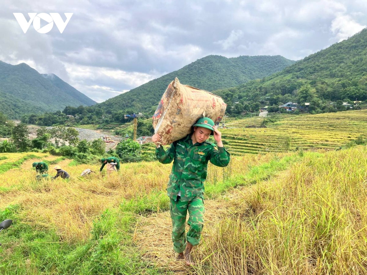Mồ hôi dẫm áo, bao lúa trĩu nặng vai nhưng nụ cười của chiến sĩ áo xanh vẫn rạng rỡ.