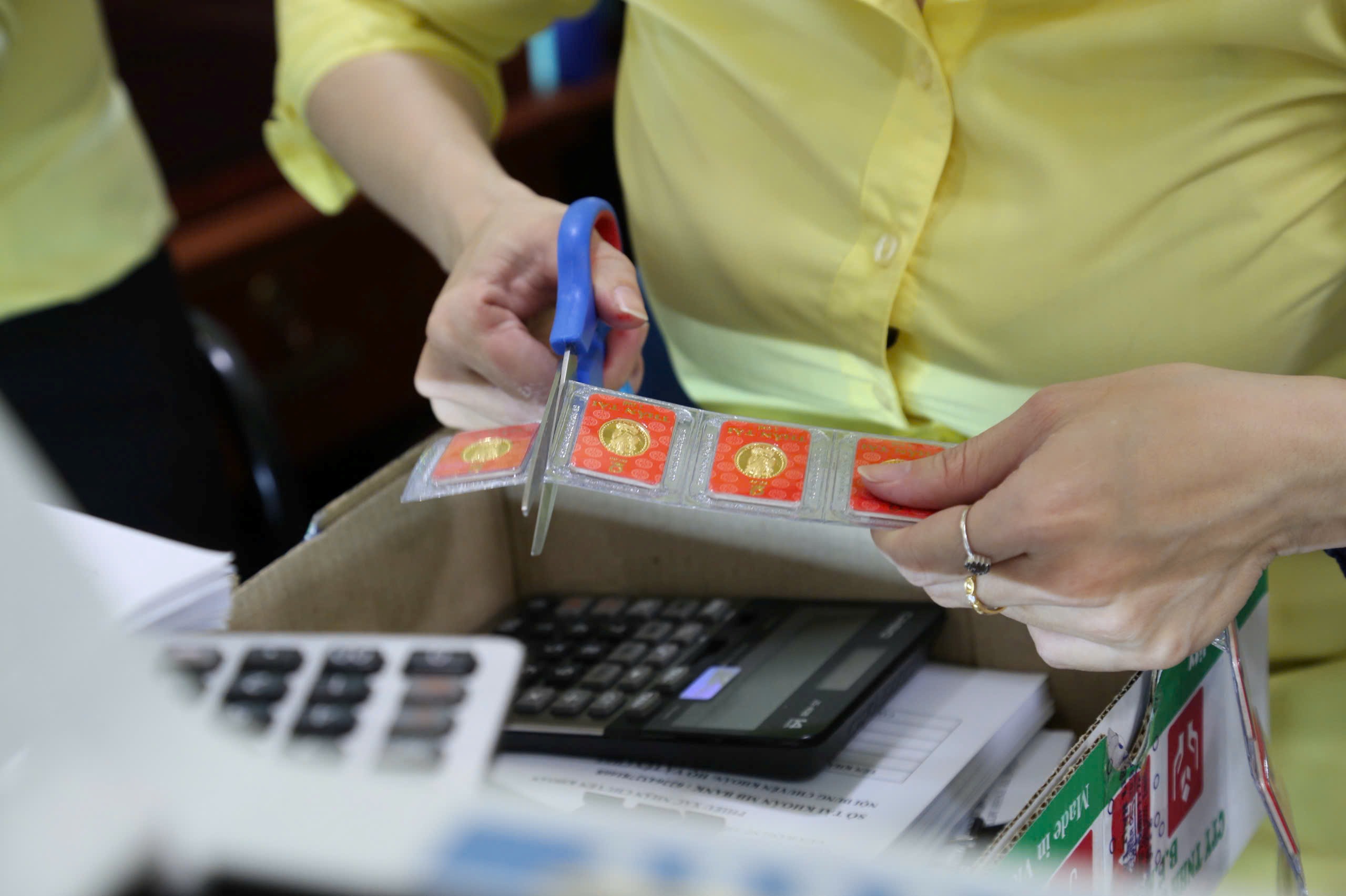 Với lượng khách tăng cao, nhân viên được bố trí túc trực, hỗ trợ khách mua vàng theo thứ tự.