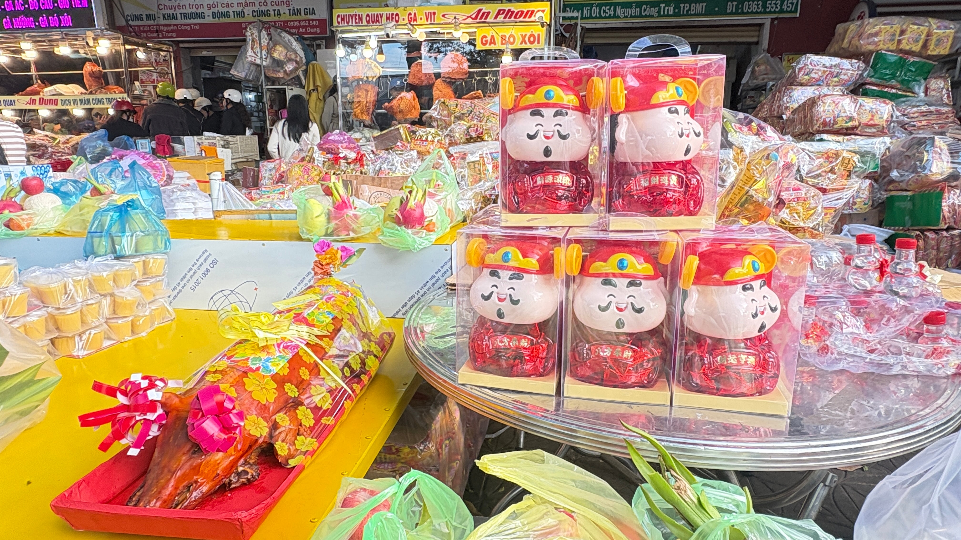 Tượng Thần Tài, heo quay và các lễ vật được bày bán đa dạng, đáp ứng nhu cầu cúng vía đầu năm
