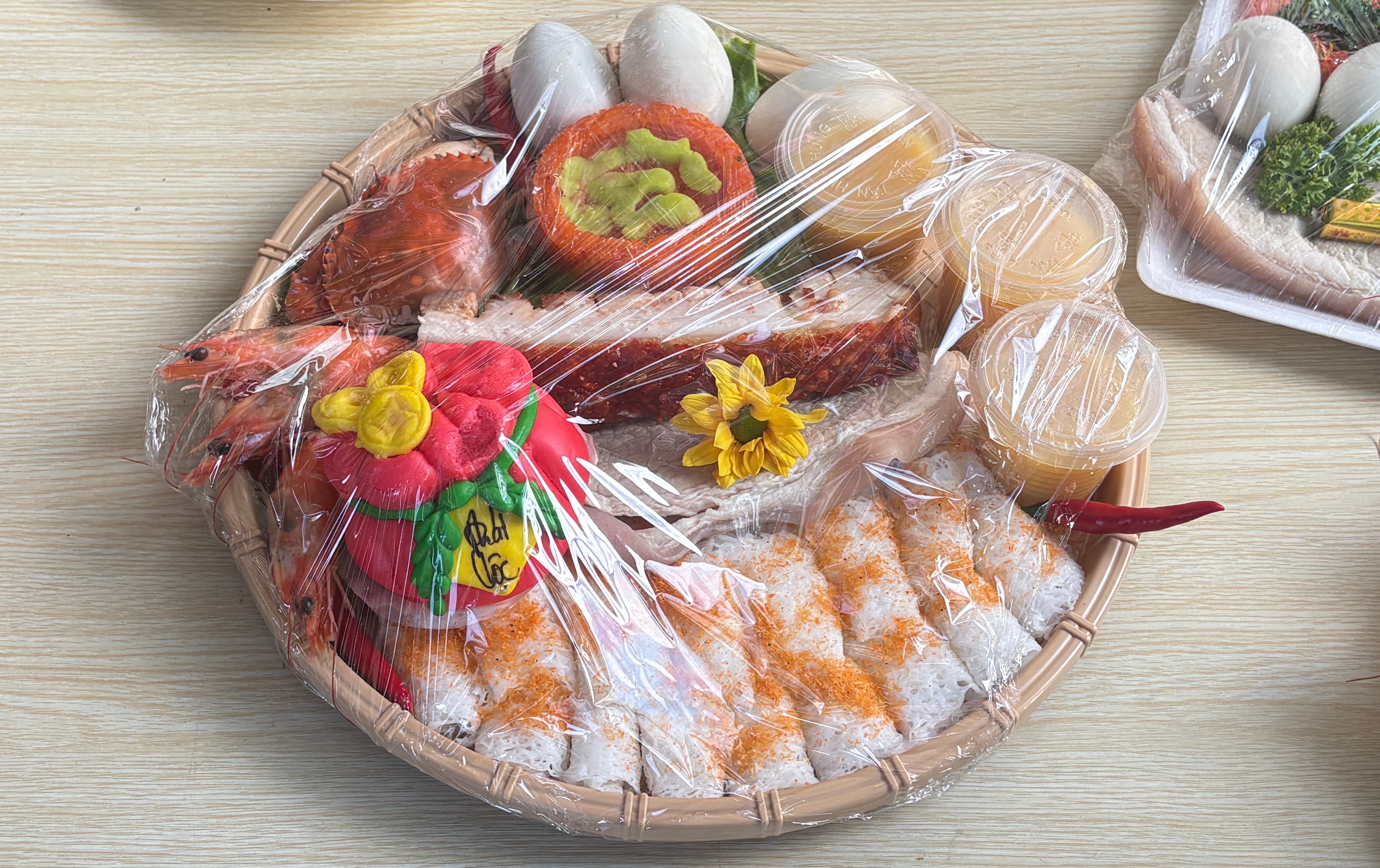 Mâm lễ trọn gói gồm heo quay, tôm, trứng, xôi, chè… được chuẩn bị sẵn, tiện lợi cho khách hàng