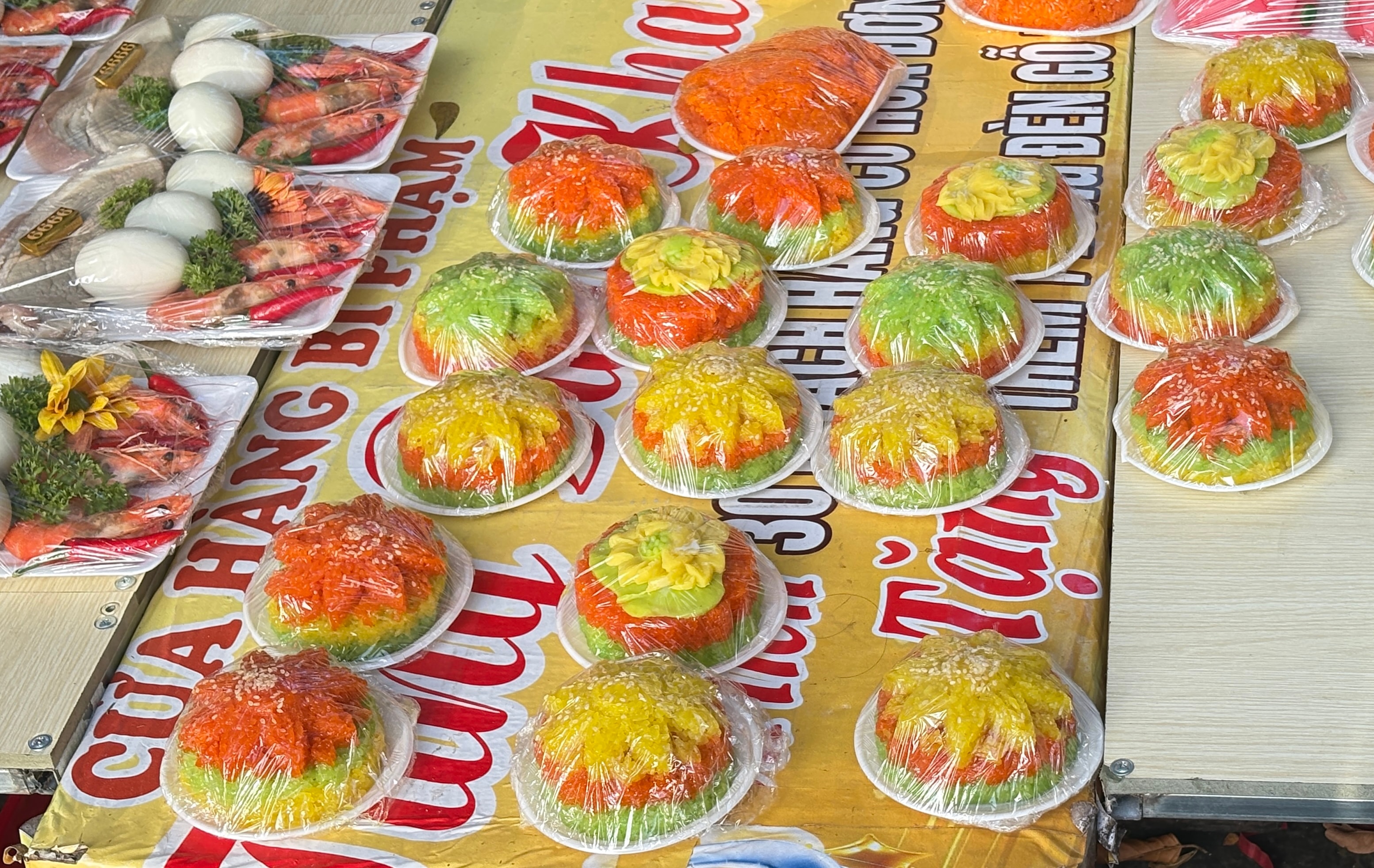 Xôi ngũ sắc tạo hình hoa được bày bán sẵn