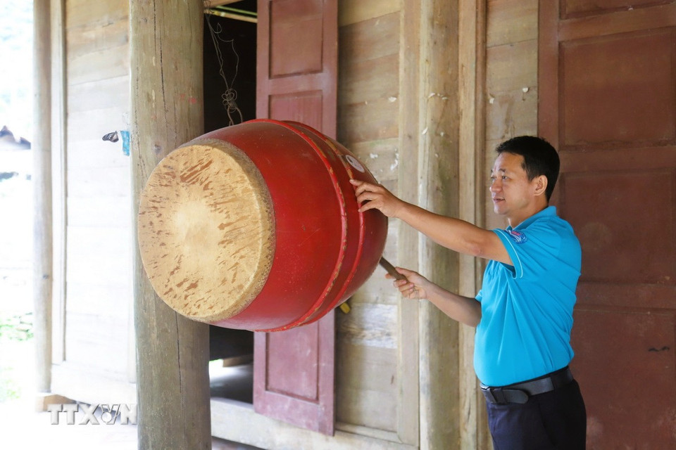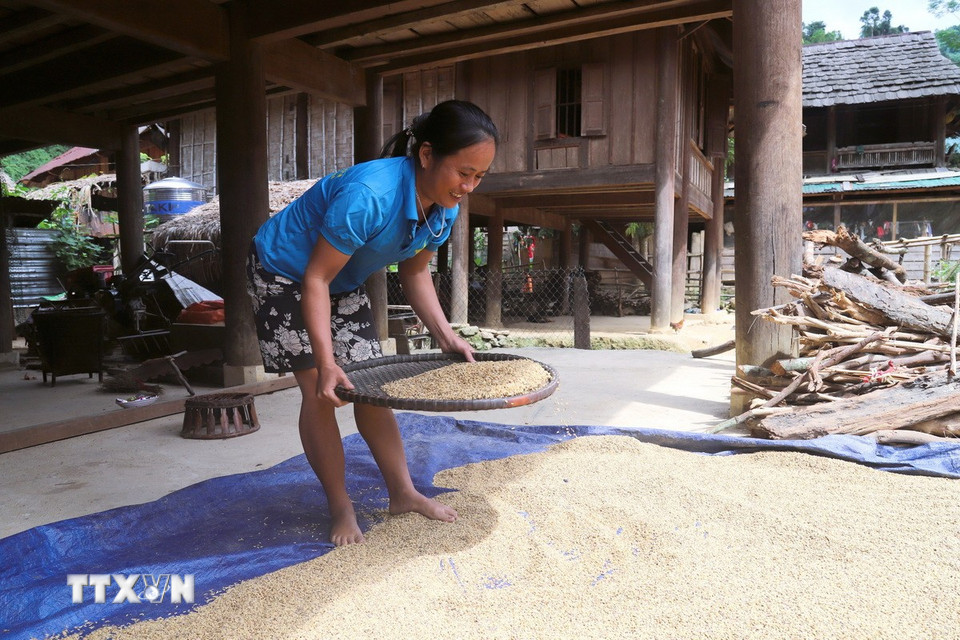 Sàng sẩy và phơi lúa trong khoảnh sân nhỏ dưới nhà sàn truyền thống của đồng bào Thái ở bản Na Ngân (Nghệ An). (Ảnh: Xuân Tiến/TTXVN)