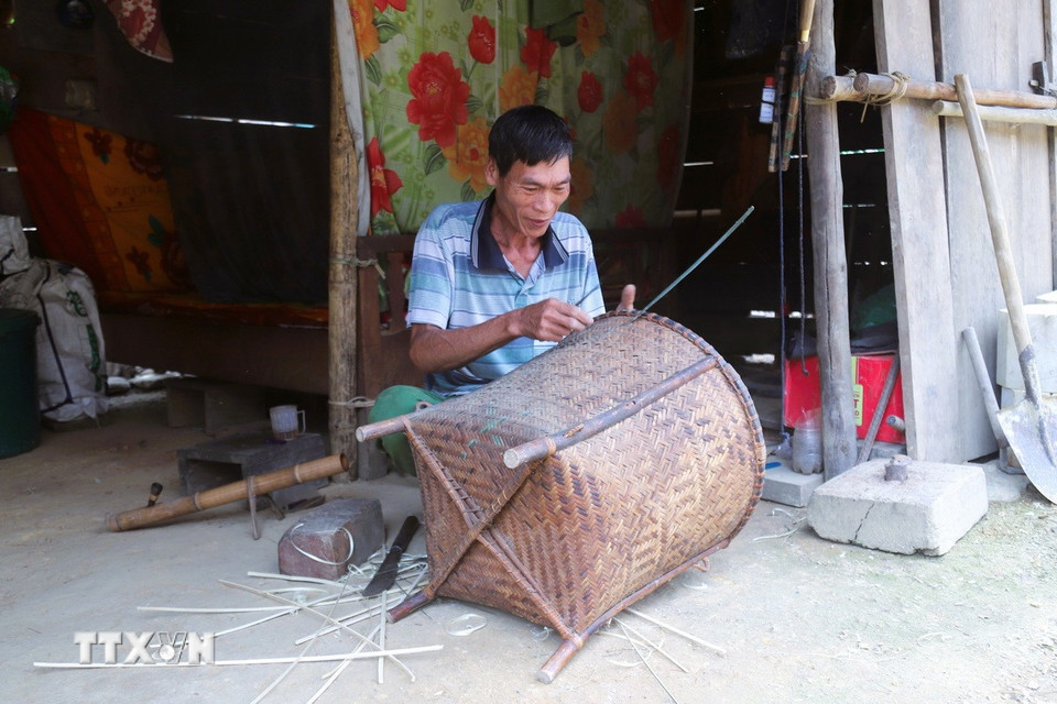 Người dân trong bản Na Ngân đan lát, sửa chữa lại vật dụng gia đình sau lũ, phục vụ việc vận chuyển thóc cho mùa thu hoạch lúa đang đến. (Ảnh: Xuân Tiến/TTXVN)