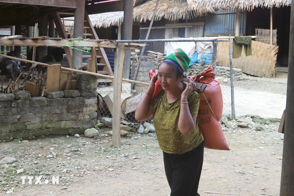 Phụ nữ bản Na Ngân gùi lúa từ nương rẫy về bản làng. (Ảnh: Xuân Tiến/TTXVN)