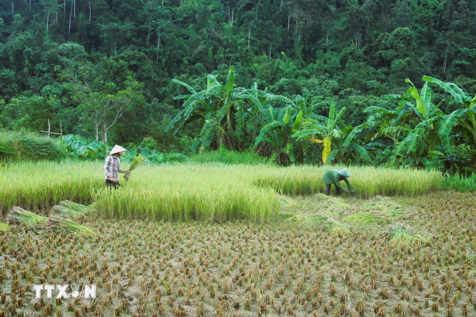 Đồng bào Thái thu hoạch lúa trên ruộng bậc thang, dưới chân núi Pù Hiêng (Nghệ An). (Ảnh: Xuân Tiến/TTXVN)