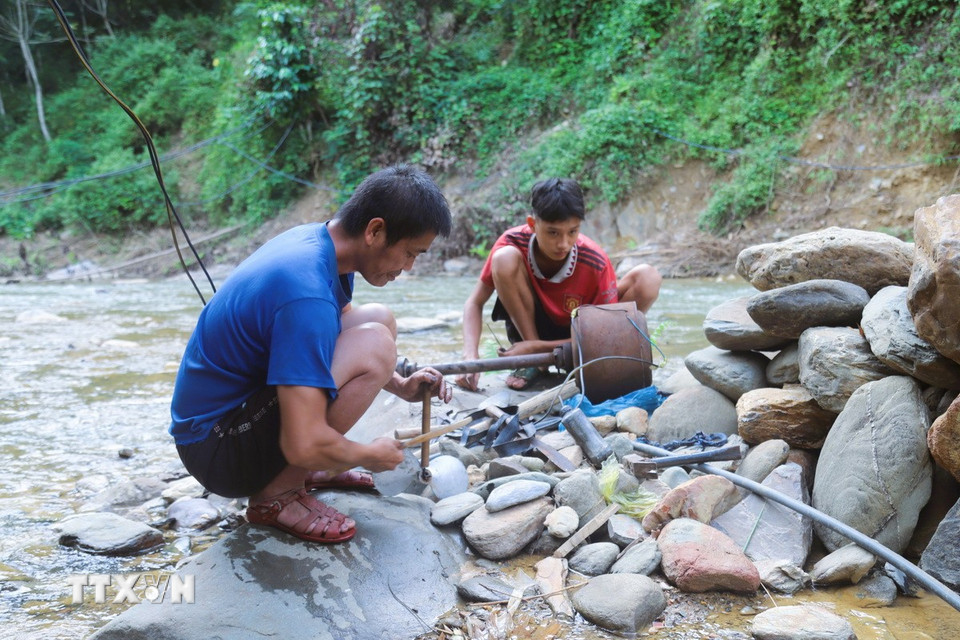 Người dân bản Na Ngân sửa chữa, lắp đặt máy phát điện chạy bằng sức nước trên suối Nậm Ngân. (Ảnh: Xuân Tiến/TTXVN)