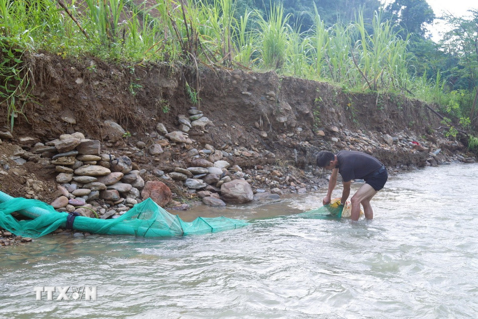 Người dân bản Na Ngân xếp đá đắp bờ, sửa chữa lại các diện tích ao nuôi ven suối Nậm Ngân, bị hư hỏng do lũ quét, để tái thả cá. (Ảnh: Xuân Tiến/TTXVN)