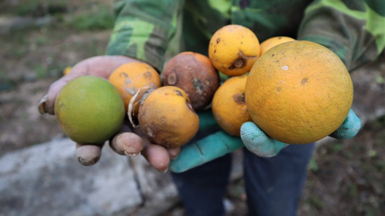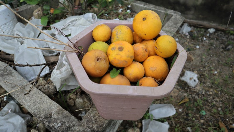 Nhiều quả cam đã hỏng chờ rụng.