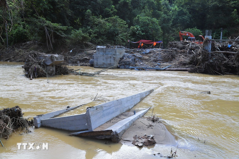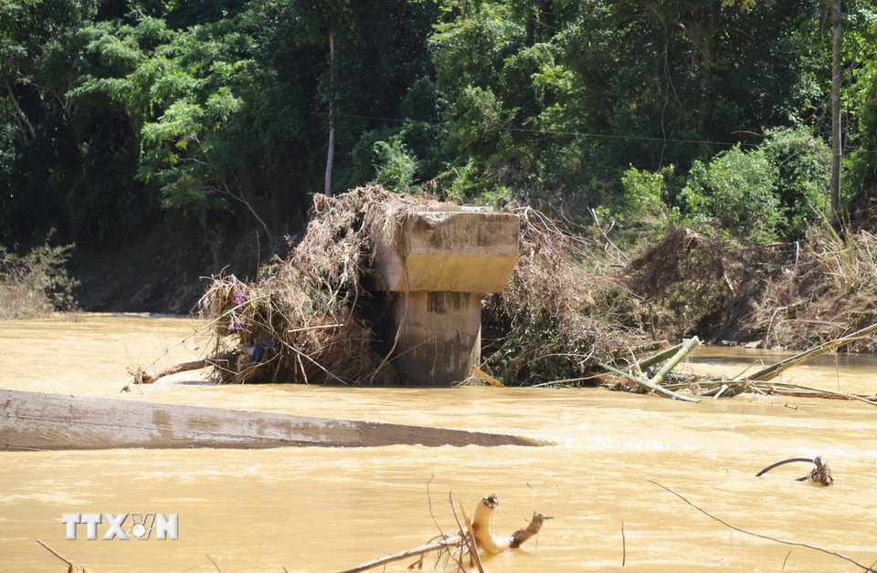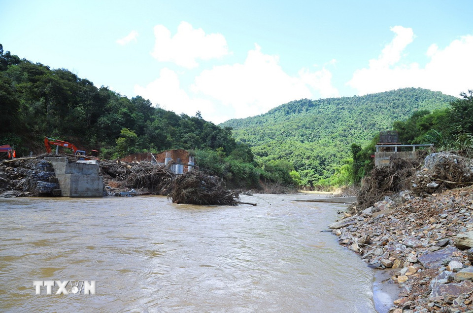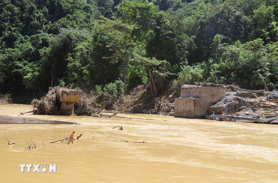 Hiện trường cầu Xốp Chạng (km82+900) trên quốc lộ 48C bị lũ dữ tàn phá, cuốn trôi nhịp cầu trong ngày 29/9. (Ảnh: Xuân Tiến/TTXVN)