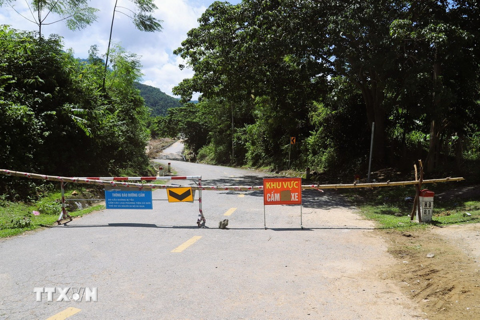 Rào chắn được thiết lập hai bên đầu cầu Xốp Chạng (Km 82+900) trên Quốc lộ 48C để cảnh báo, cấm các loại phương tiện lưu thông nhằm đảm bảo an toàn. (Ảnh: Xuân Tiến/TTXVN)