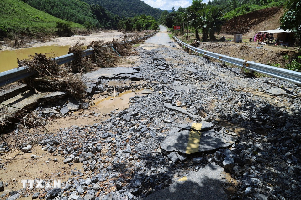 Việc di chuyển qua điểm km82 trên Quốc lộ 48C hết sức khó khăn đối với các loại phương tiện do mặt đường bị lũ gây xói mòn, cày nát và đứt gãy mặt đường trên chiều dài hàng chục mét. (Ảnh: Xuân Tiến/TTXVN)