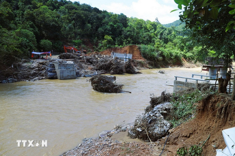 Hiện trường cầu Xốp Chạng (km82+900) trên quốc lộ 48C bị lũ dữ tàn phá, cuốn trôi nhịp cầu trong ngày 29/9. (Ảnh: Xuân Tiến/TTXVN)