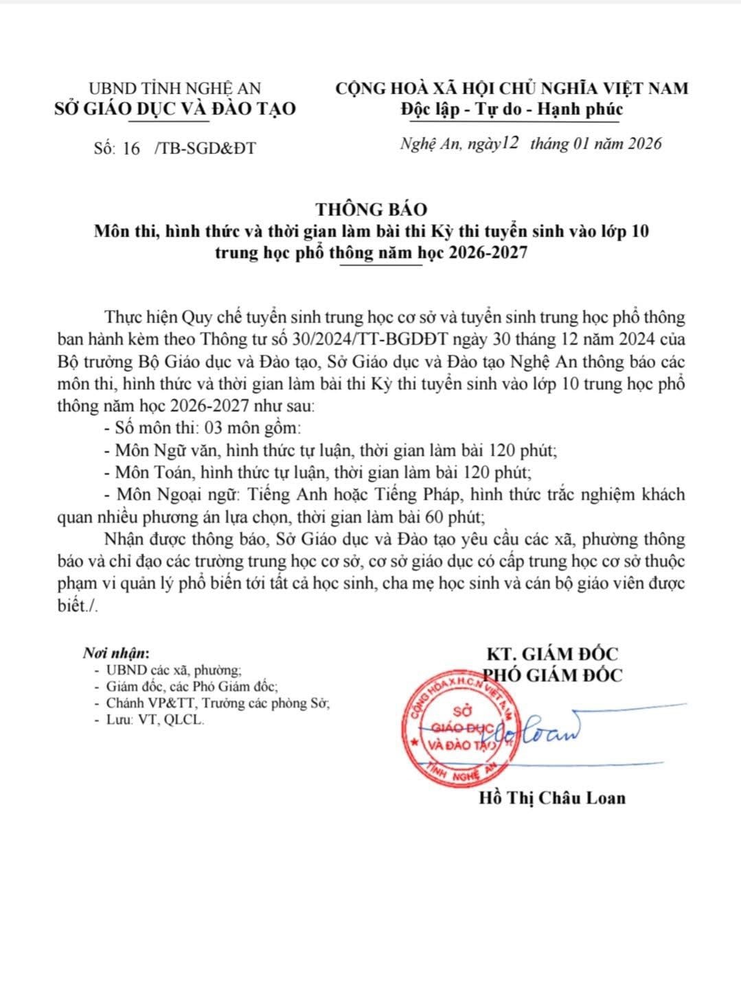 Thông báo về môn thi, hình thức thi và thời gian làm bài Kỳ thi tuyển sinh vào lớp 10 THPT năm học 2026 – 2027 của Sở GD-ĐT tỉnh Nghệ An.