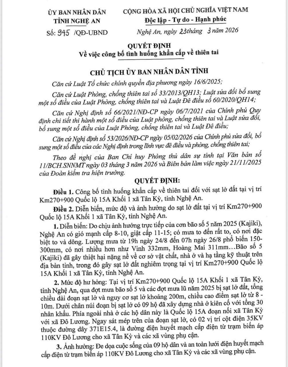 UBND tỉnh Nghệ An vừa ban hành Quyết định số 945/QĐ-UBND ngày 23/3/2026 về việc công bố tình huống khẩn cấp về thiên tai tại Km270+900, Quốc lộ 15A, xã Tân Kỳ do ảnh hưởng bởi cơn bão số 5 (Kajiki).