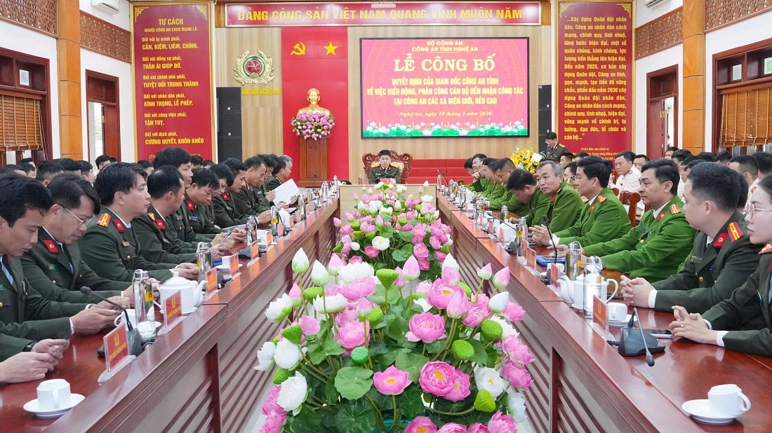 Thực hiện chủ trương của Bộ Công an và Công an tỉnh Nghệ An về tăng cường lực lượng cho địa bàn cơ sở, ngày 6/3/2026, Giám đốc Công an tỉnh đã ký quyết định điều động 103 cán bộ đến công tác tại 40 xã biên giới, rẻo cao của tỉnh. Trong đó, có 29 cán bộ từ các đơn vị thuộc Bộ Công an tăng cường và 74 cán bộ từ các phòng, Công an cấp xã đồng bằng.