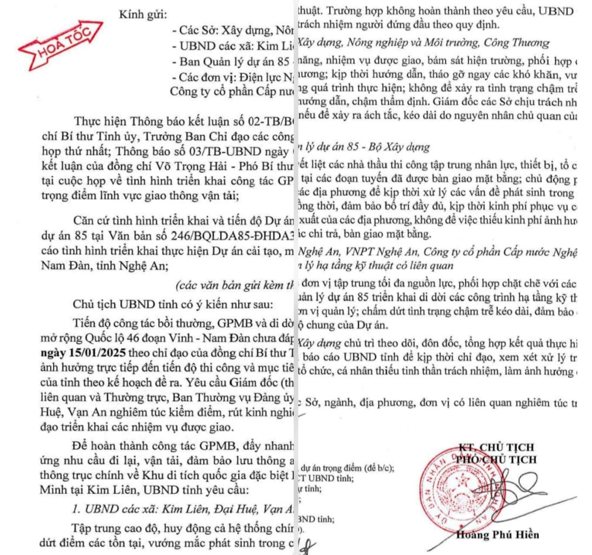 Chủ tịch UBND tỉnh cũng yêu cầu Ban Quản lý dự án 85 (Bộ Xây dựng) chỉ đạo các nhà thầu tập trung nhân lực, thiết bị thi công tại các đoạn đã có mặt bằng, đồng thời bảo đảm kinh phí chi trả GPMB kịp thời cho người dân. Các đơn vị quản lý hạ tầng kỹ thuật như Điện lực, VNPT, Công ty Cổ phần Cấp nước Nghệ An phải khẩn trương di dời các công trình bị ảnh hưởng, chấm dứt tình trạng chậm trễ kéo dài.