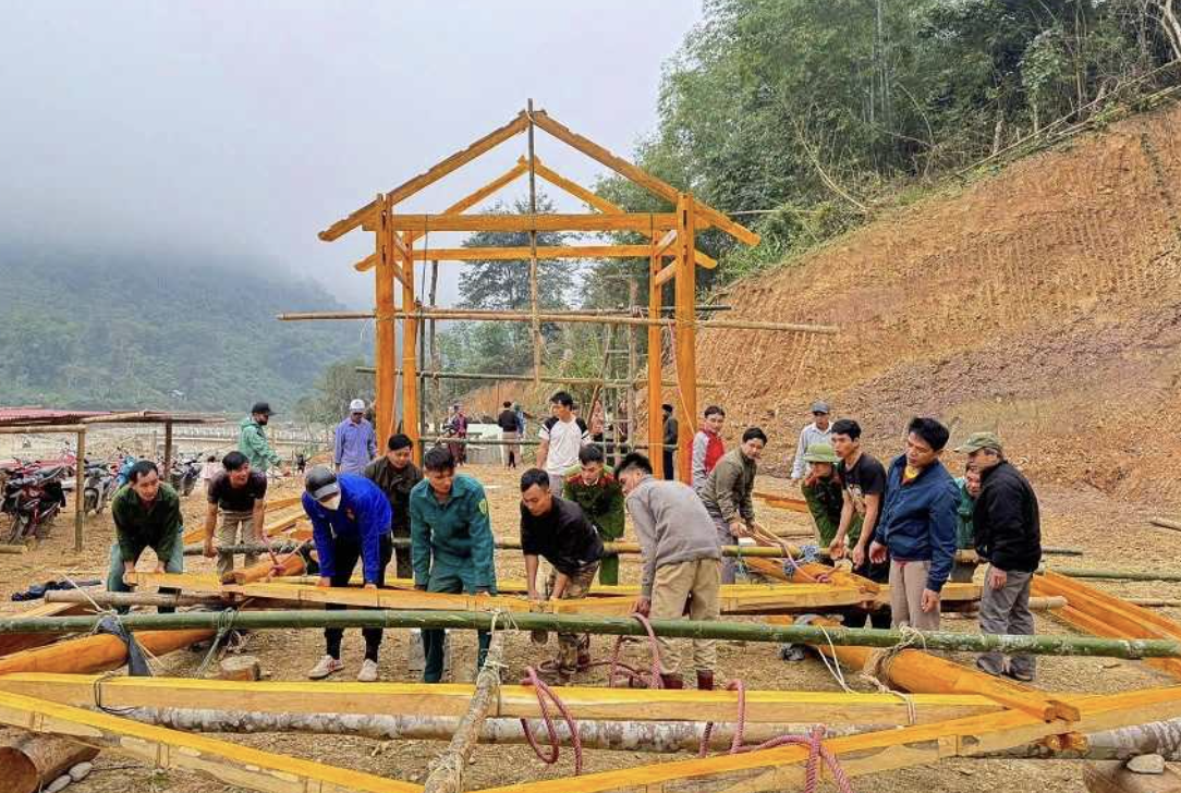 Chính quyền xã Nhôn Mai phối hợp các tổ chức, đoàn thể hỗ trợ người dân dựng lại nhà bị lũ cuốn trôi.