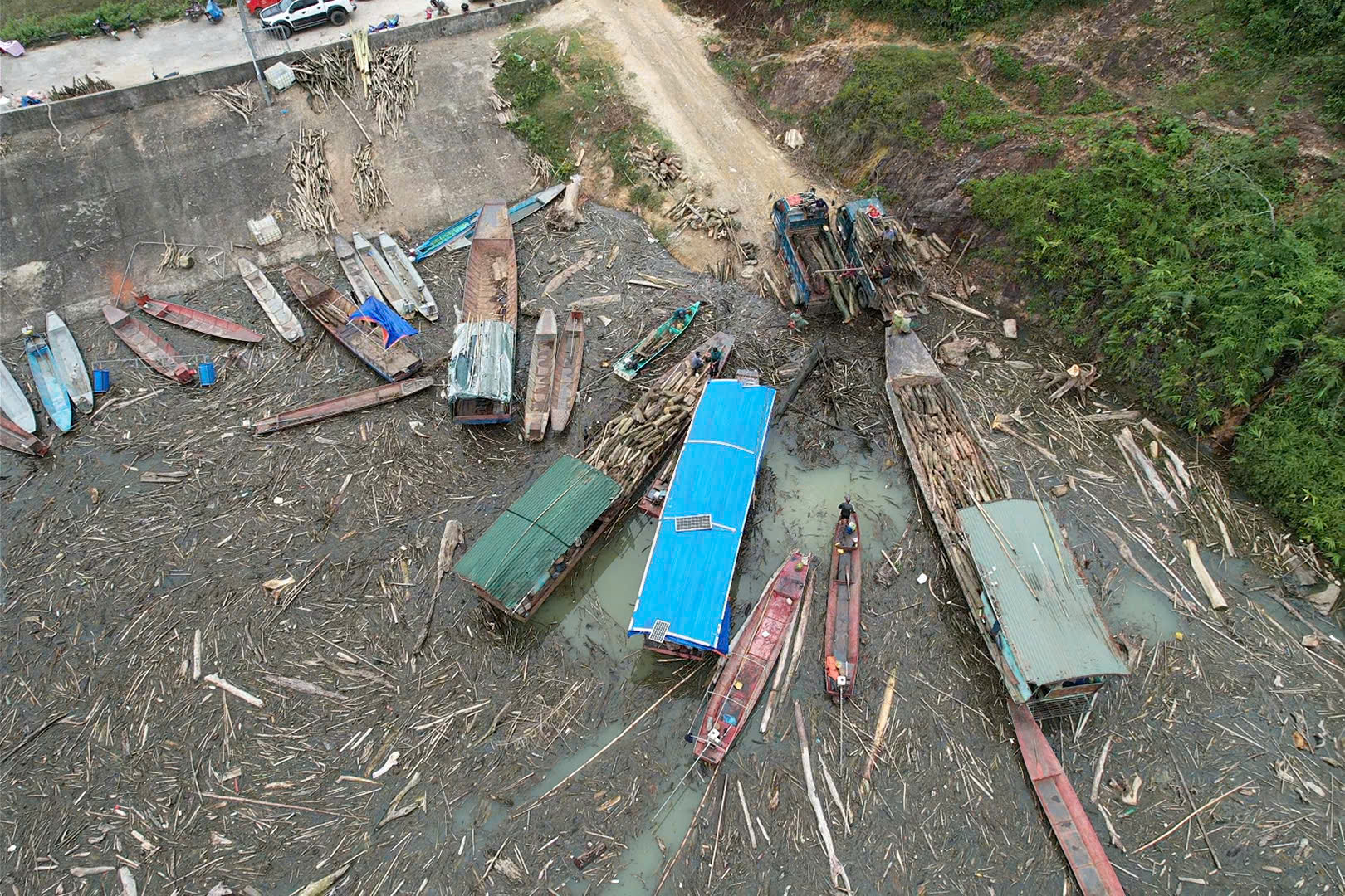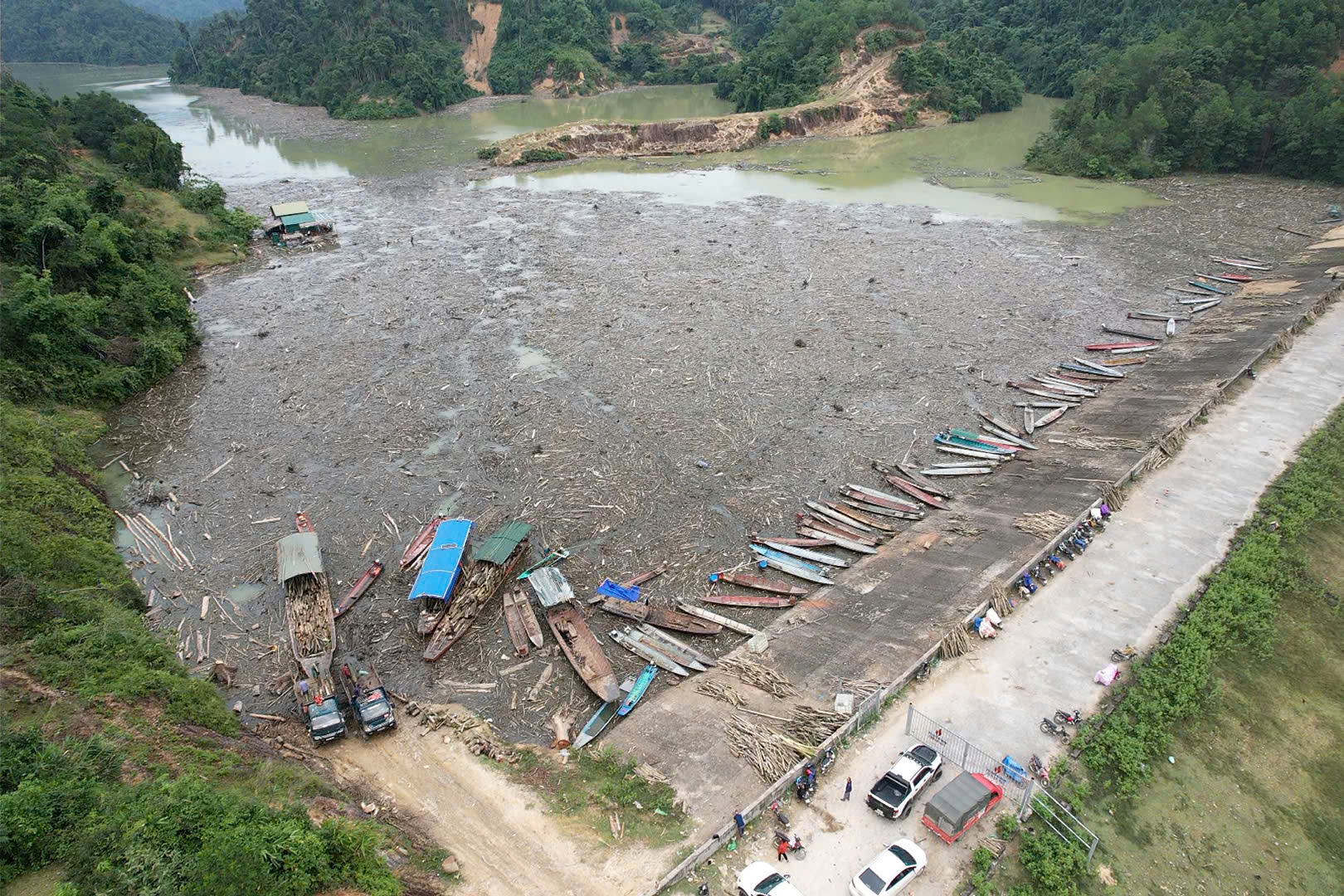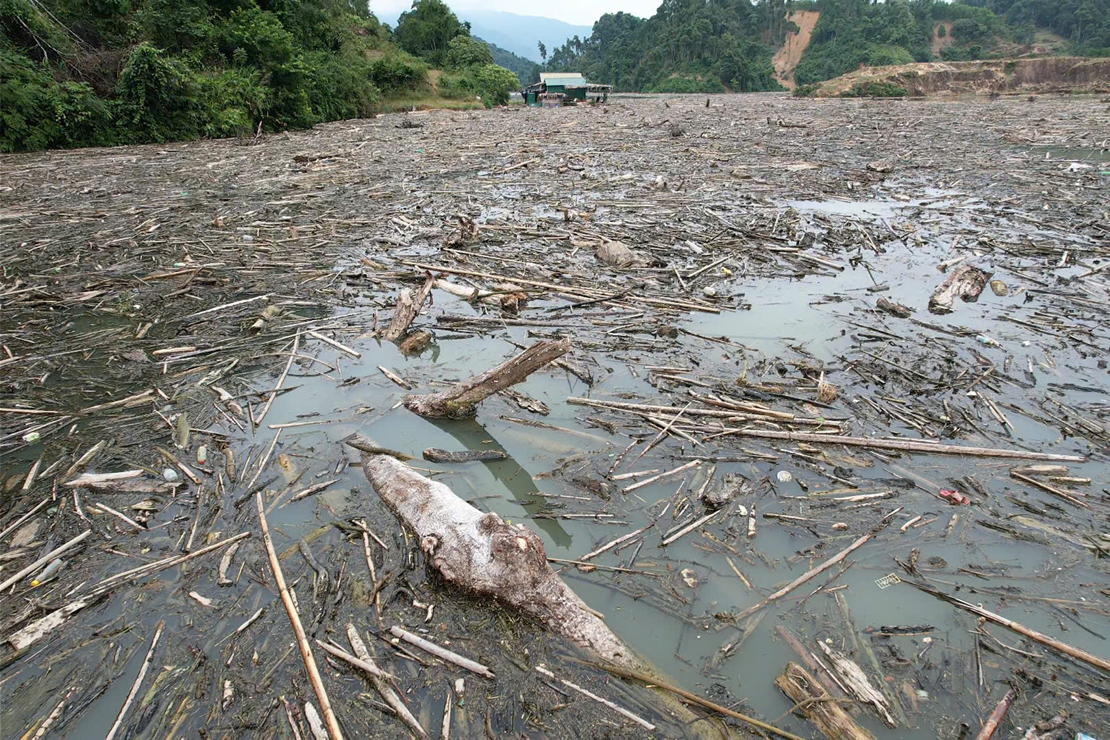 Mặt nước vốn phẳng lặng nay đặc quánh bởi lớp rác gỗ, khiến việc đi lại bằng thuyền của người dân trở nên khó khăn.