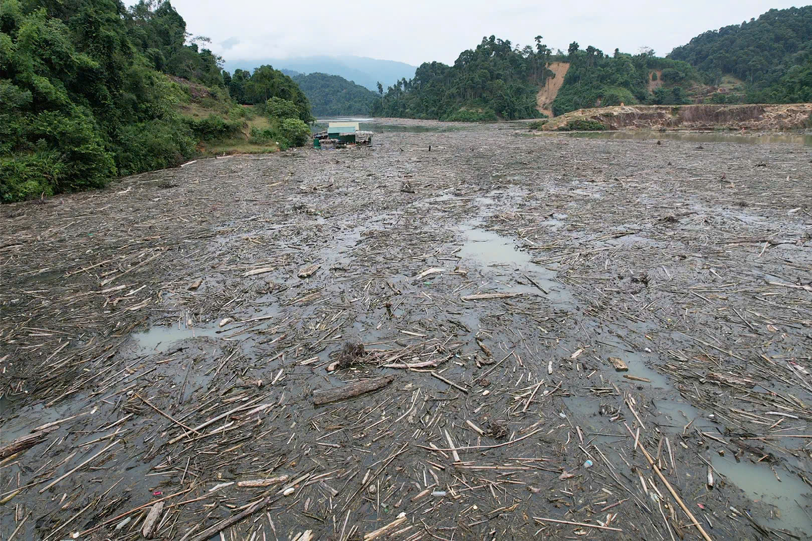 Sau đợt mưa lũ liên tiếp vừa qua, hồ thủy điện Hủa Na biến thành "biển rác" phủ kín mặt nước.